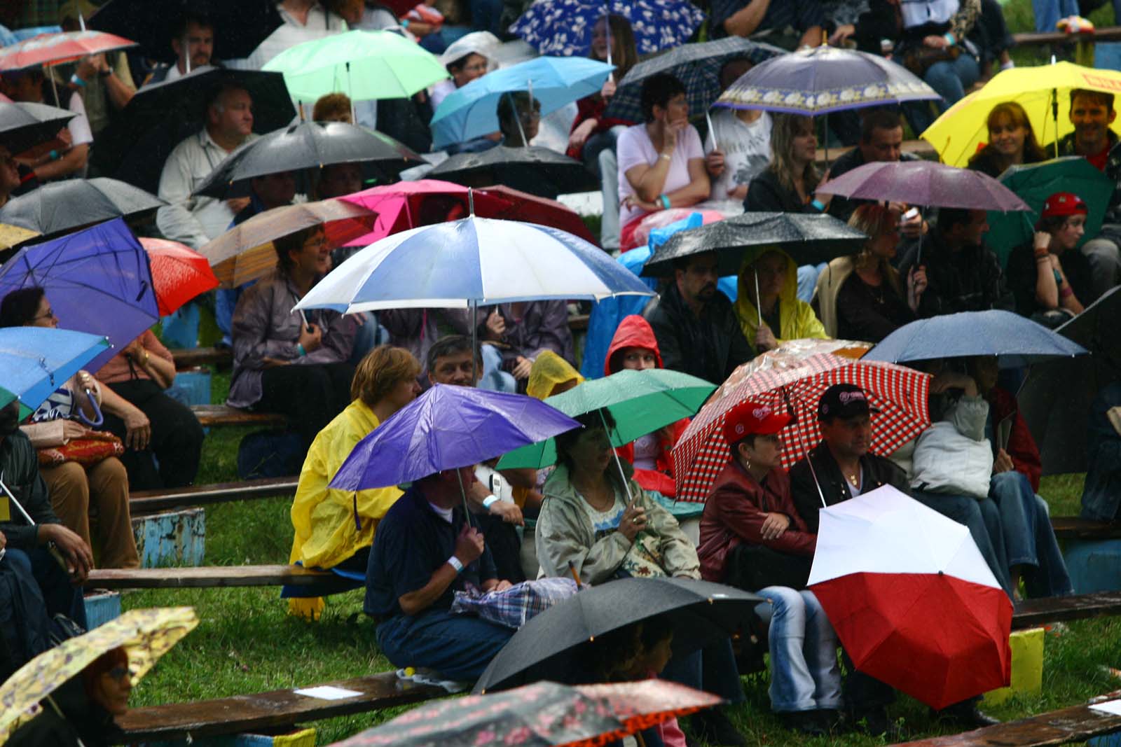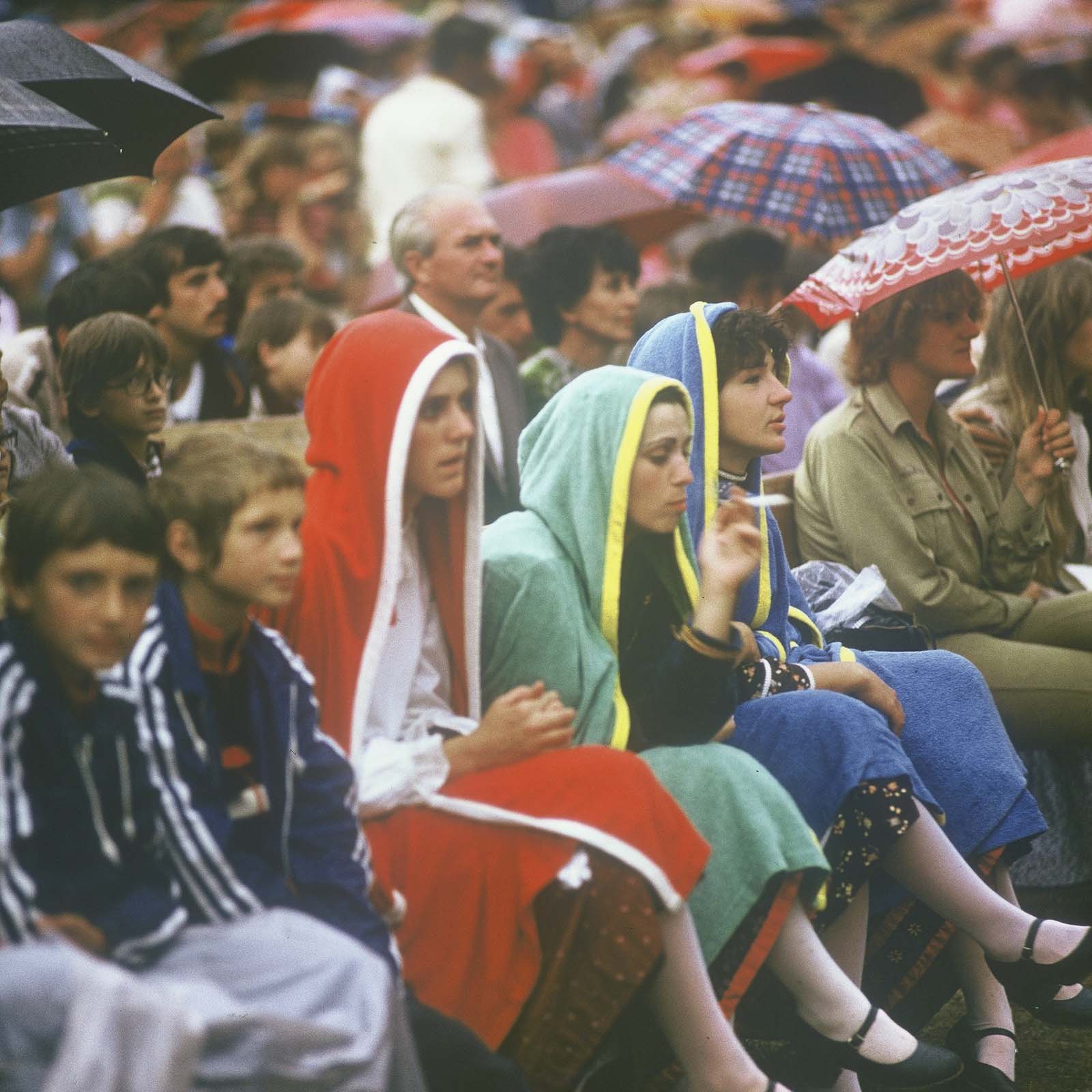 A közönség esernyők alatt. (a nézők előtt kameréval a kezében Molnár László) (XXVIII. Országos Kulturális Ünnepély) admin20 nov 20200