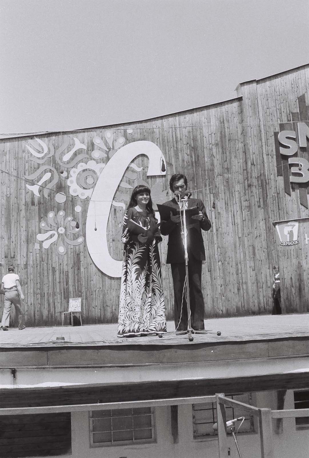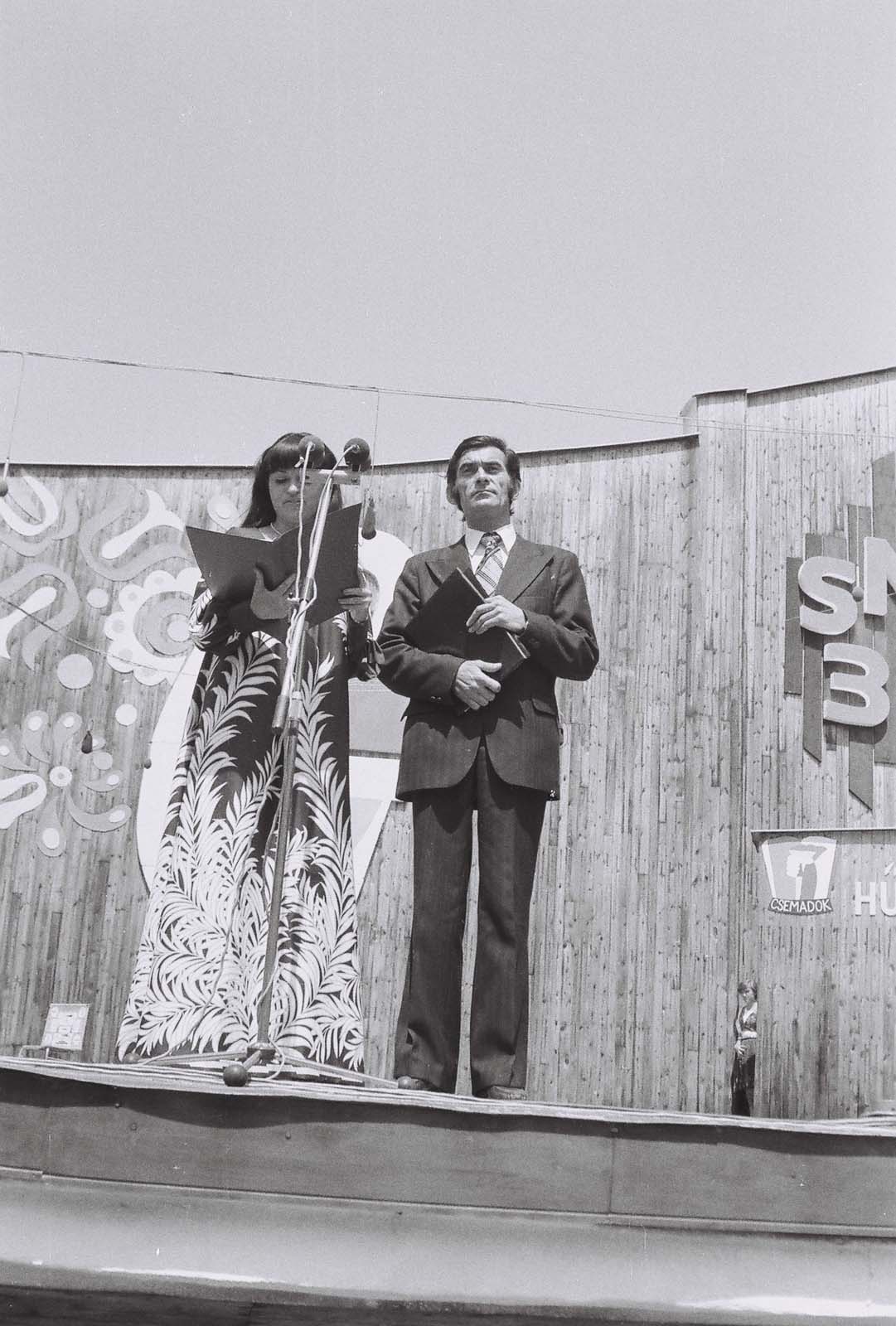 Magyarországi cigányzenekar a színpadon. Mellettük Papp Sándor főrendező és a konferáló hölgy. (XLVII. Országos Kulturális Fesztivál) admin01 nov 20200