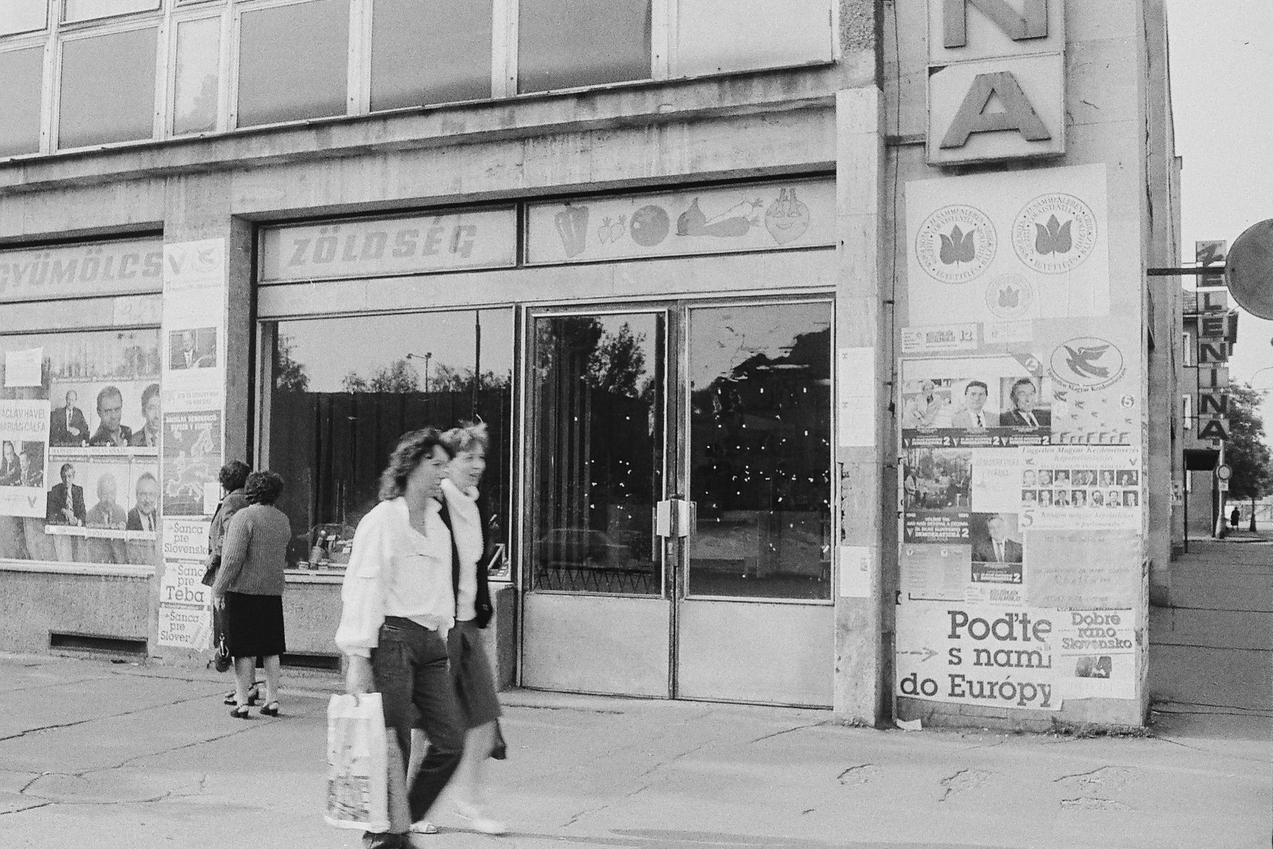 A losonci útburkolat javítása, háttérben a korabeli gombaszögi plakát.