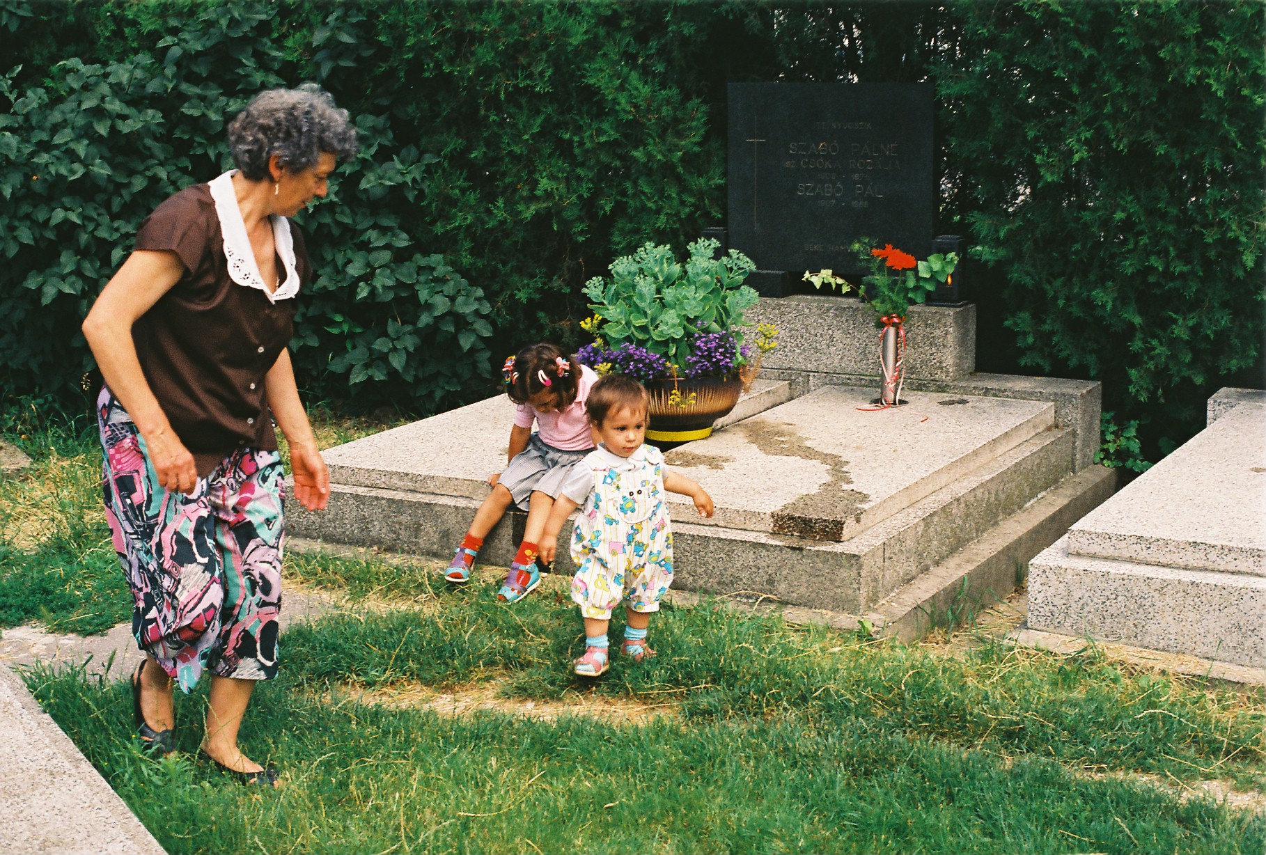 Takács Klára az unokáival, Görözdi Andrással és Ráhellal a nagyszülők sírjánál.
