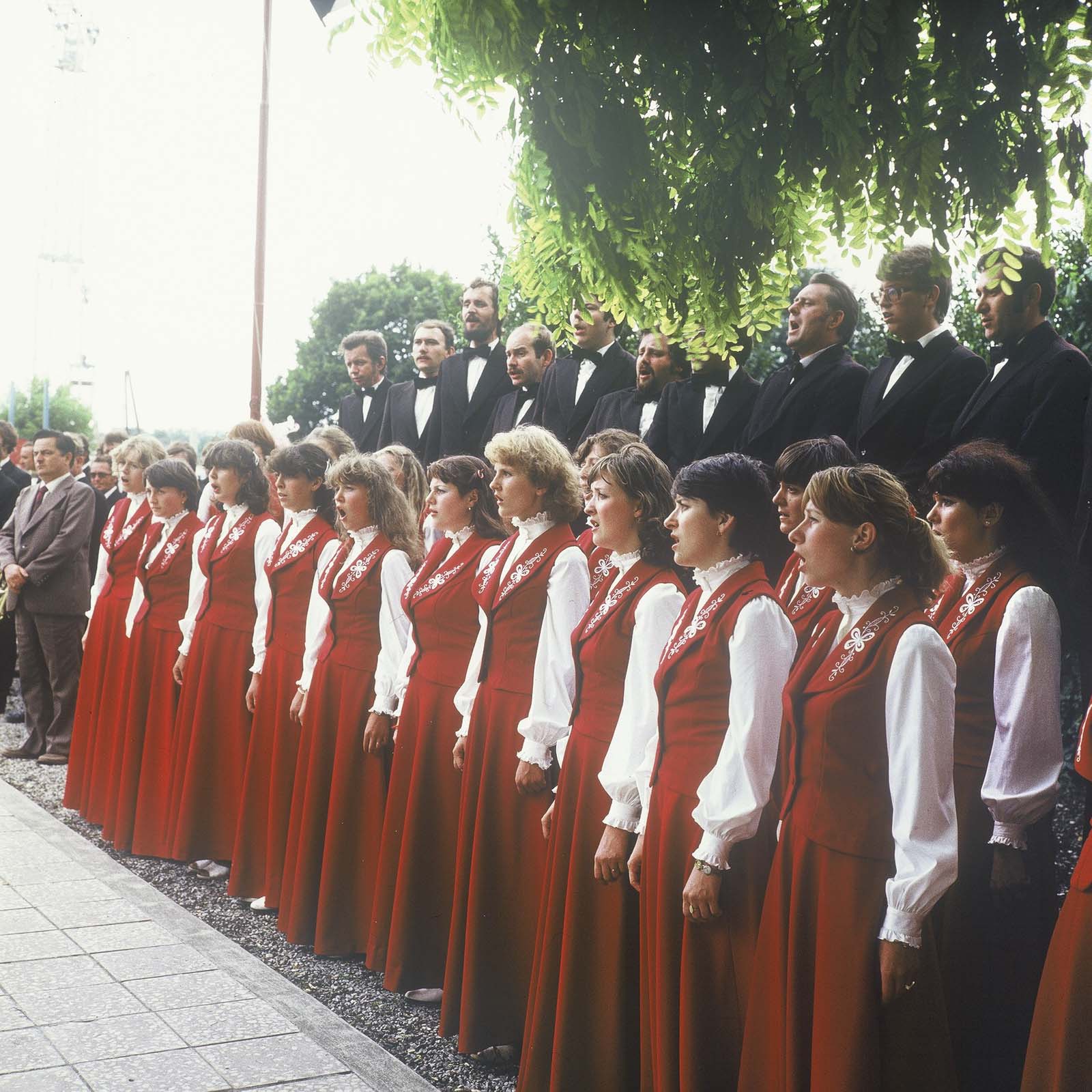 A Felszabadulási emlékmű ünnepélyes megkoszorúzása Rozsnyón a Bányászok terén. (a Csehszlovákiai Magyar Tanítók Énekkara) (XXVIII. Országos Kulturális Ünnepély)