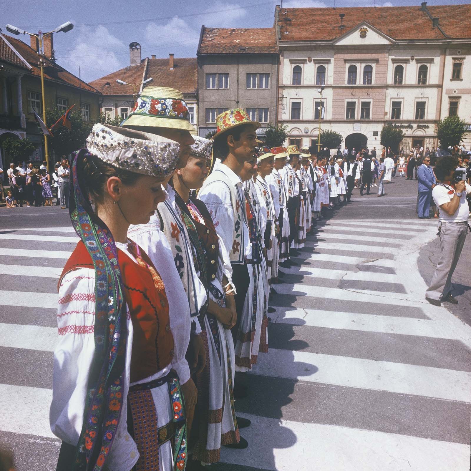 A Felszabadulási emlékmű ünnepélyes megkoszorúzása Rozsnyón a Bányászok terén. (a Szőttes Népművészeti Együttes táncosai) (XXVIII. Országos Kulturális Ünnepély)