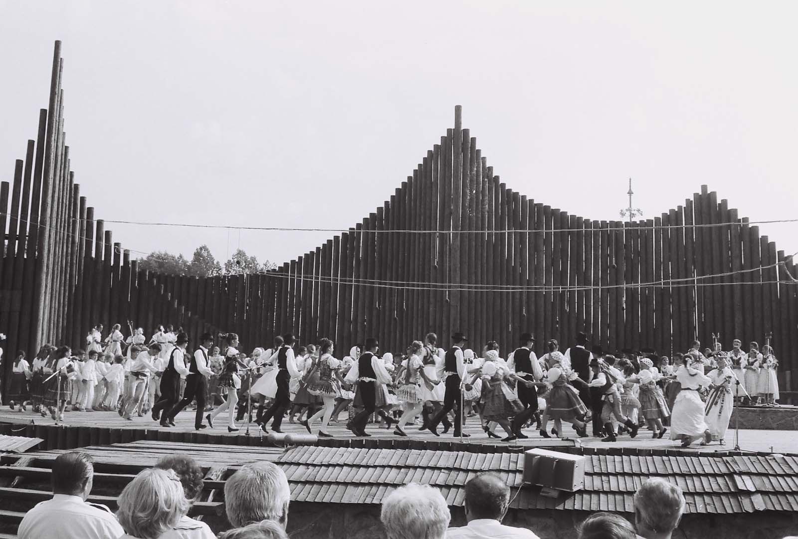 A gyermekcsoportok műsorának záróképe, előtérben a Kisbojtár Gyermek Néptáncegyüttes. (Vichodnai Folklórfesztivál 1986)