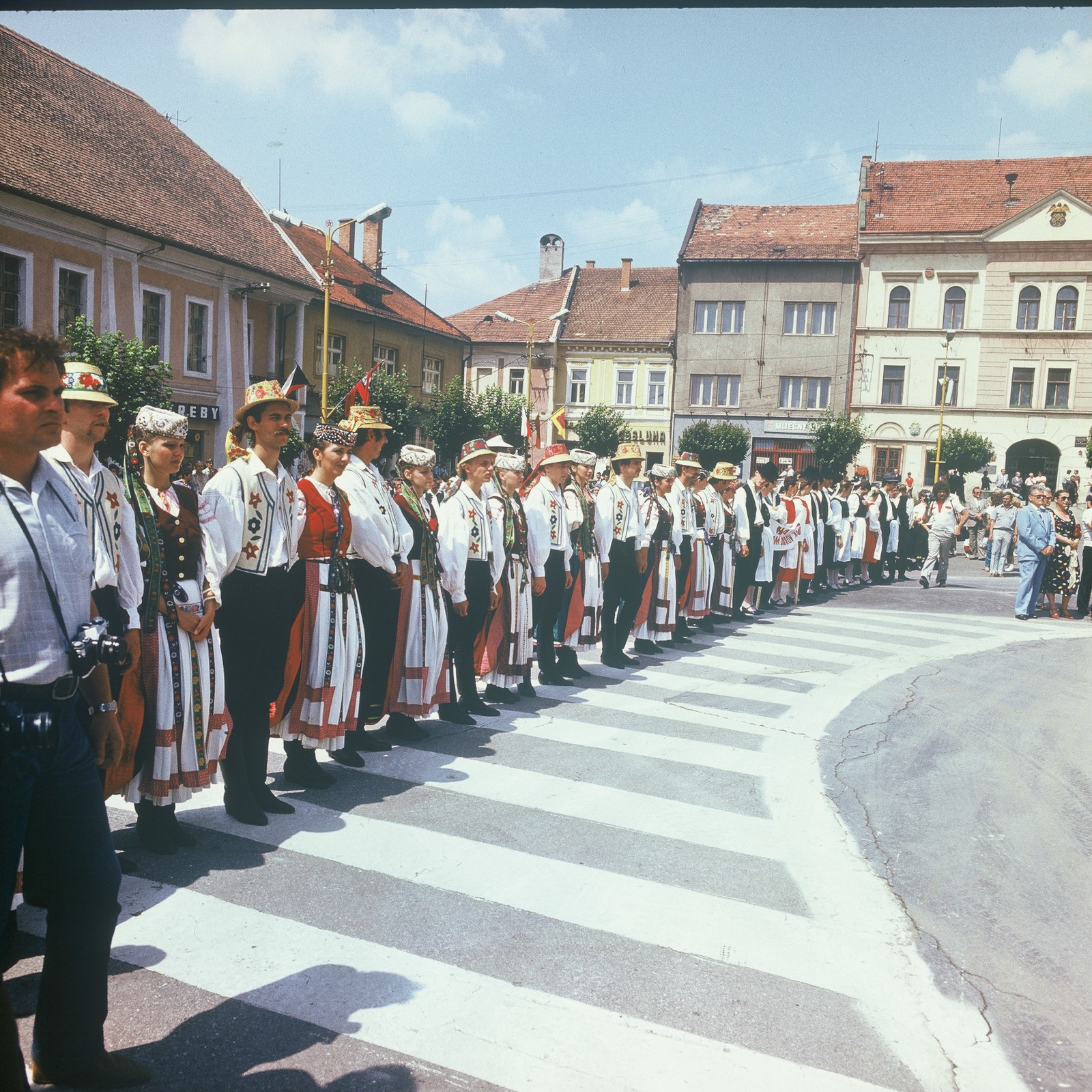 A koszorúzásra felsorakozott csoportok Rozsnyón a Bányászok terén. (az elején a Szőttes Népművészeti Együttes tagjai) (XXVIII. Országos Kulturális Ünnepély)