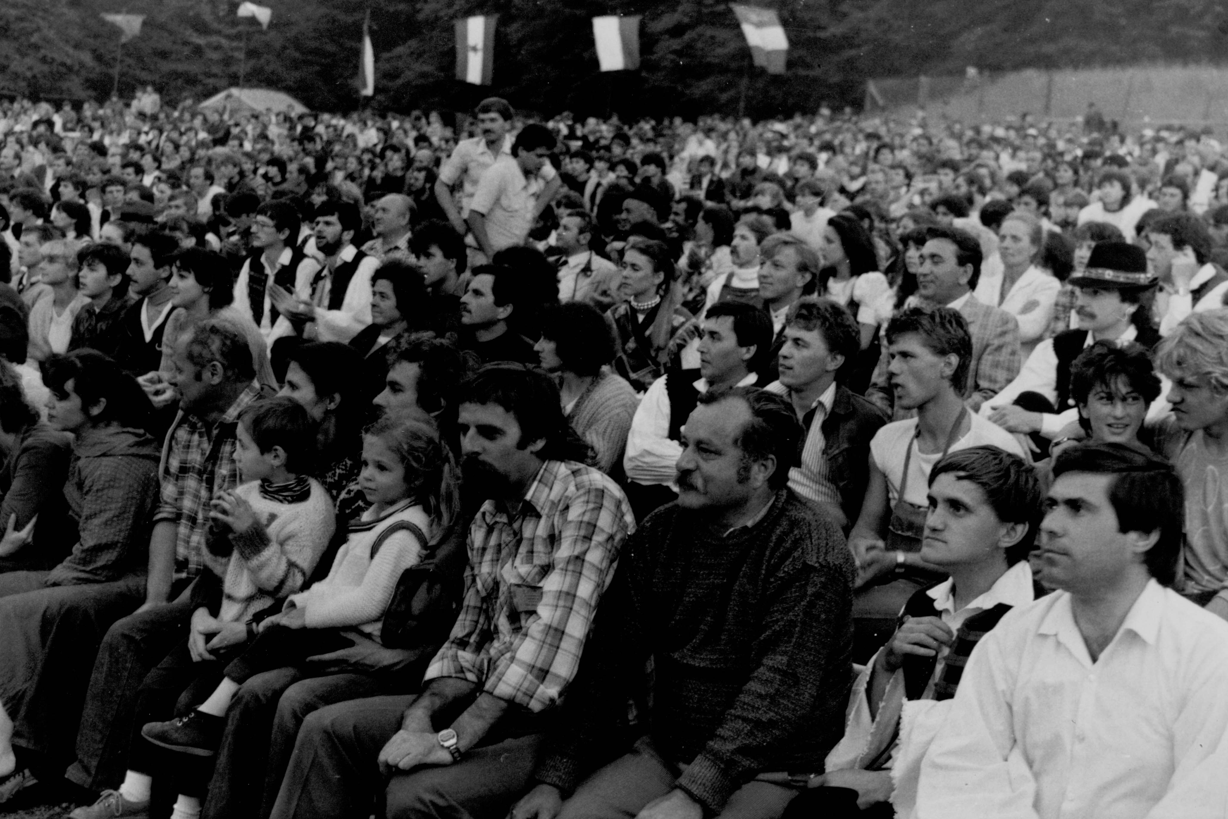A közönség. (jobbról 3. Hégli Gyula a Kisbojtár GyTCs vezetője). (XXI. Országos Dal- és Táncünnepély, Gombaszög)