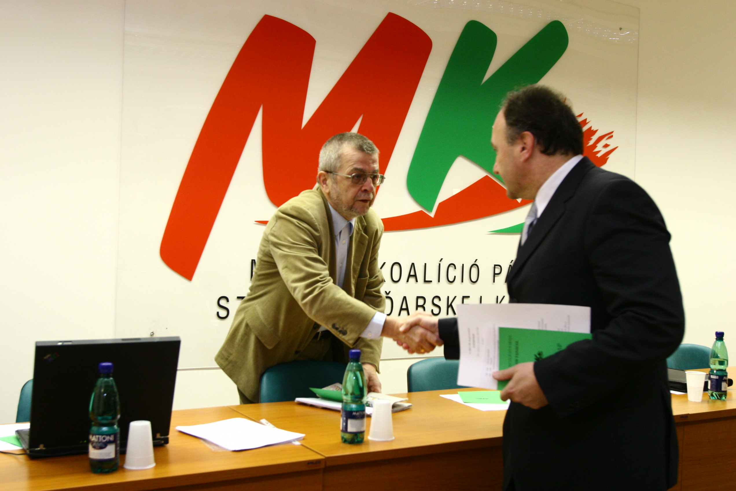 A Magyar Koalíció Pártjának országos tanácsa Pozsonyban. A képen A. Nagy László és Csáky Pál.