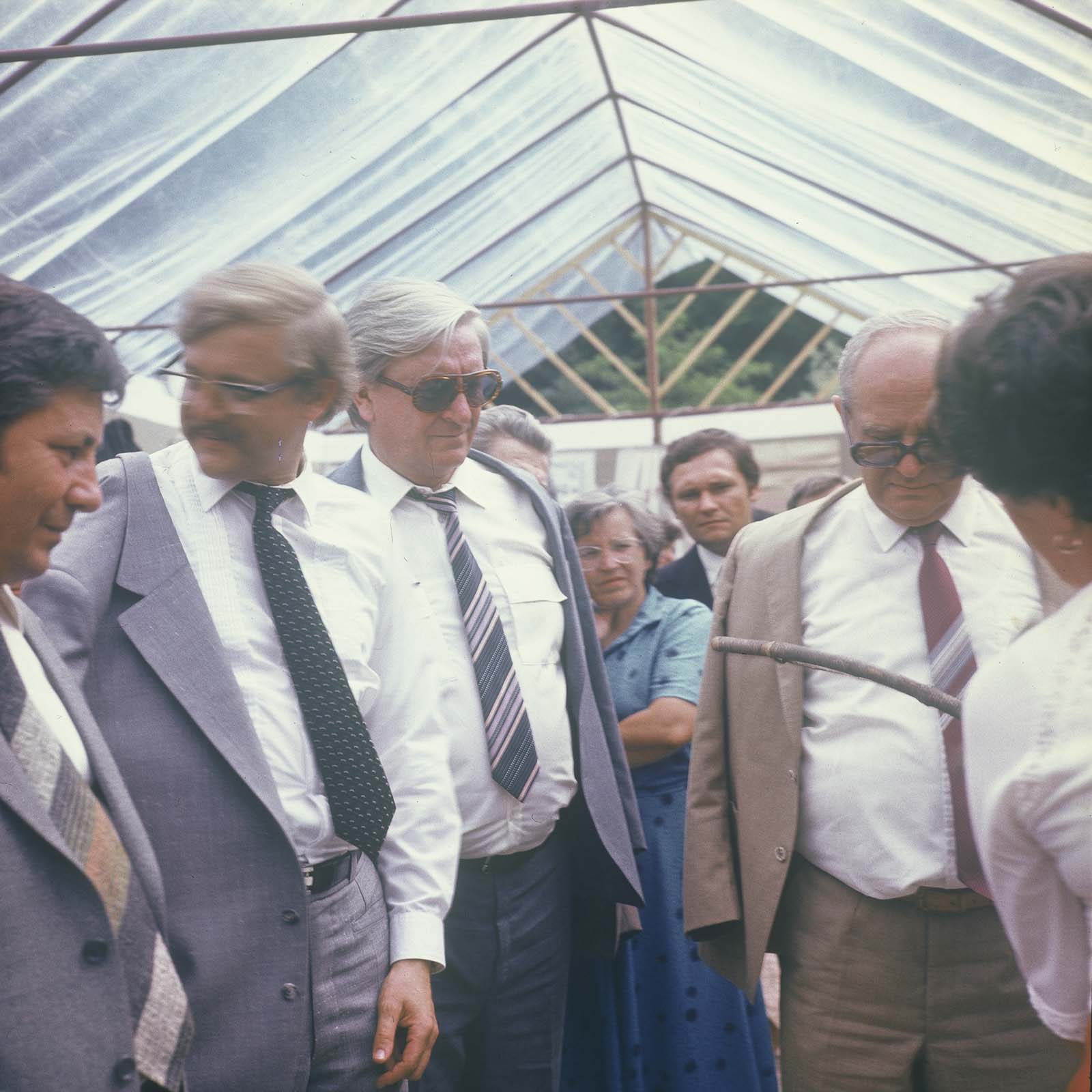 A politikai küldöttség a néprajzi kiállítás sátrában. (a képen balról a 2. Sidó Zoltán a Csemadok KB elnöke, 3. Jozef Mravik miniszter helyettes) (XXIII. Országos Kulturális Ünnepély)