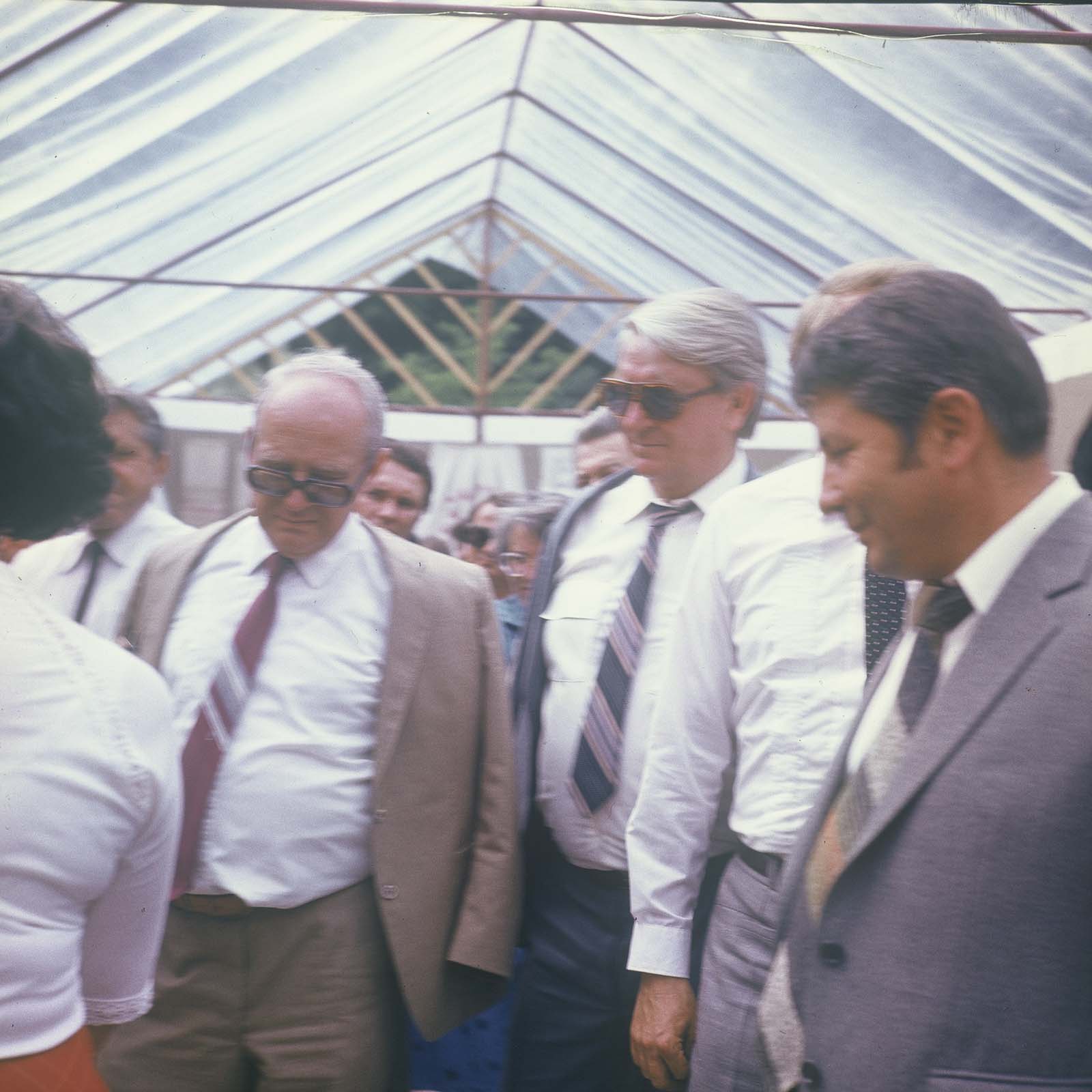 A politikai küldöttség a néprajzi kiállítás sátrában. (a képen balról Viliam Pezlár az SzlKP titkára, Jozef Mravik miniszter helyettes) (XXIII. Országos Kulturális Ünnepély)