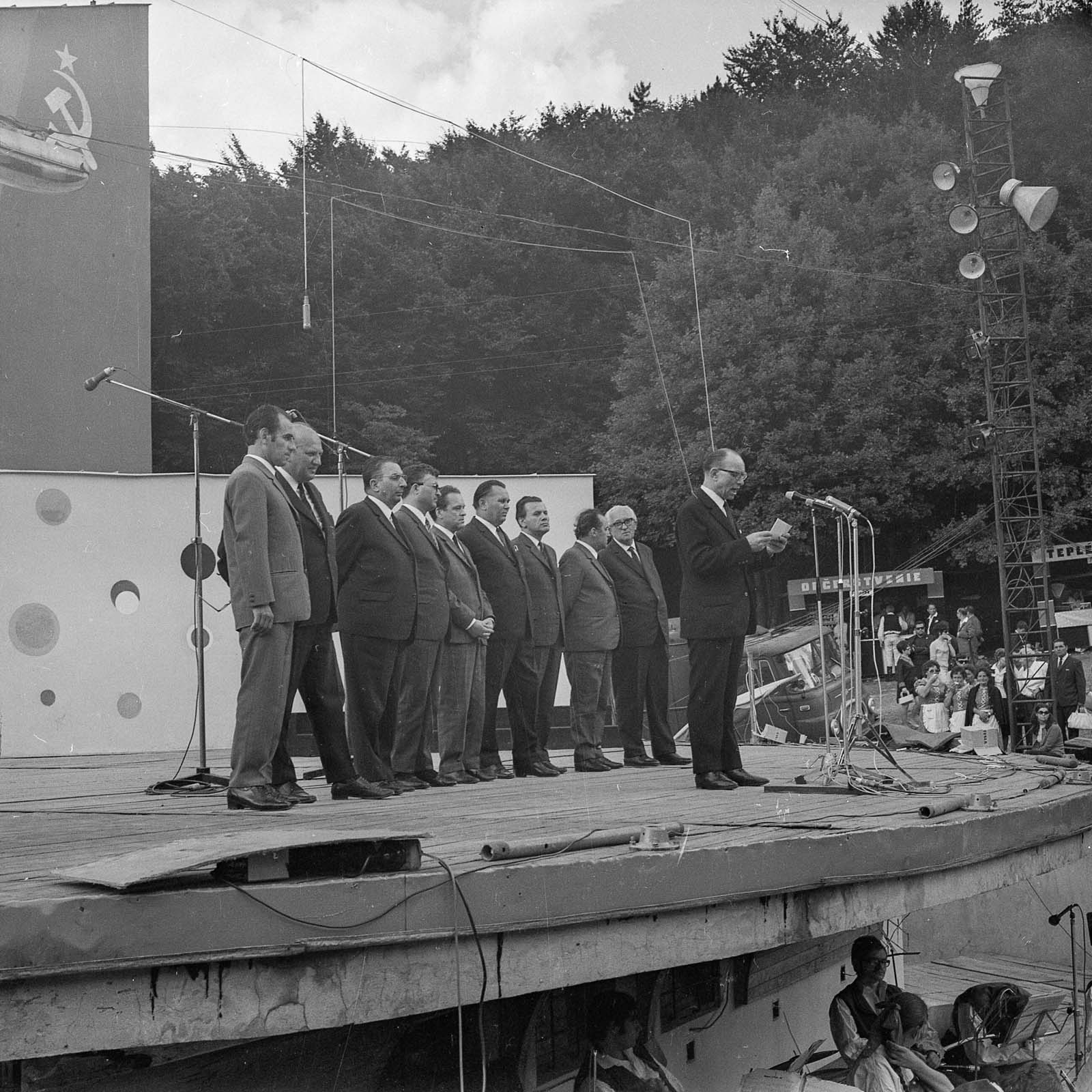 A politikai küldöttség, mikrofonnál Fábry István a Csemadok elnöke. (XVI. Országos Dal- ás Táncünnepély)