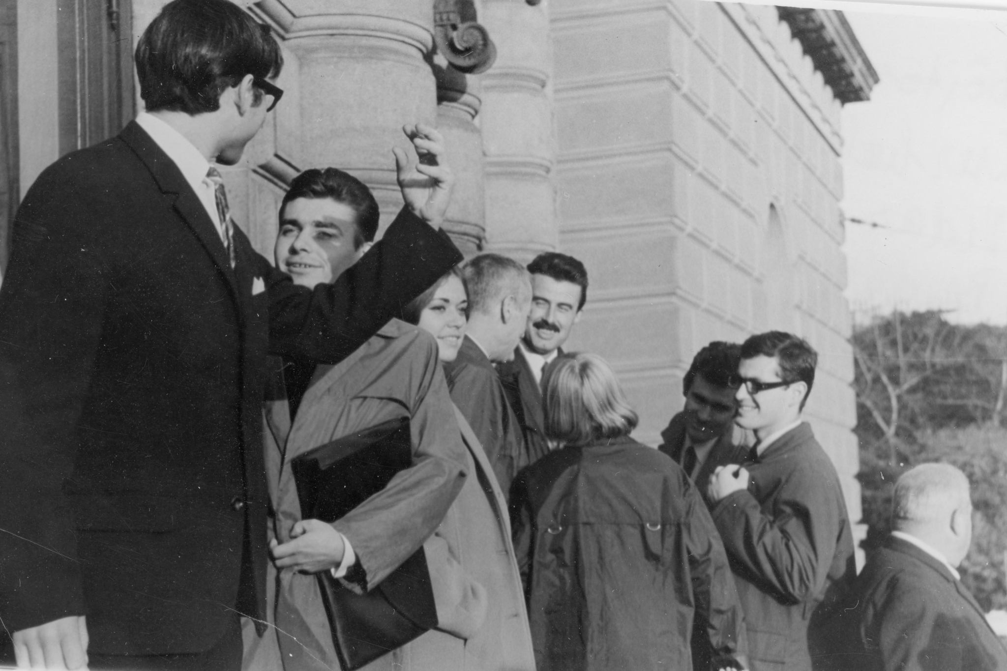 A prágai Ady Endre Diákkör tagjai. Balról jobbra: Böjtös József, Cserhalmi Gy., Vidas Panni, Bredár Gyula, Duka-Zólyomi Árpád. Jobbról második: Futó Endre.