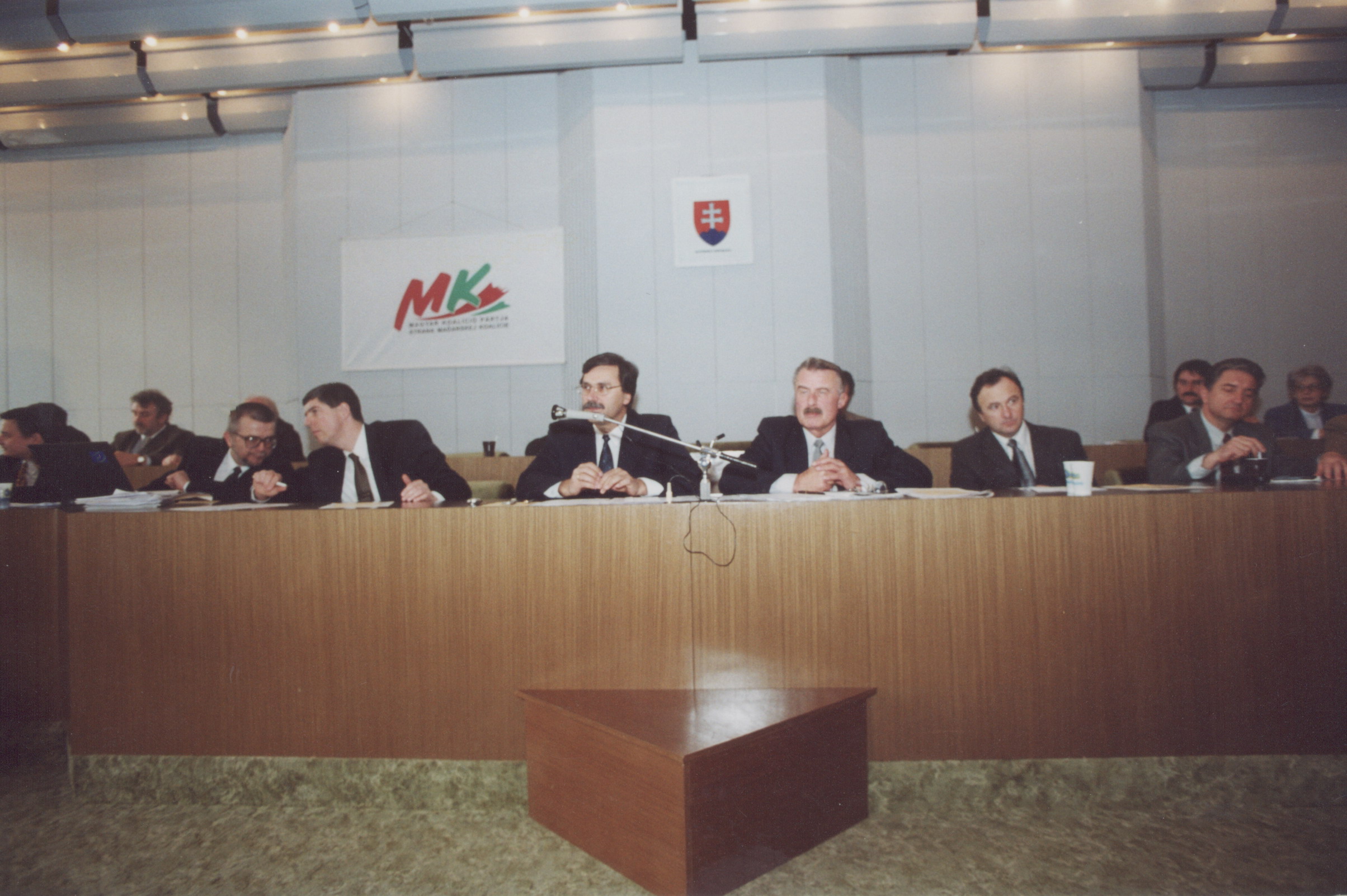 Az MKP galántai ülése. (a képen: A. Nagy László, Bugár Béla, Farkas Pál, Duka Zólyomi Árpád, Csáky Pál, Harna István)