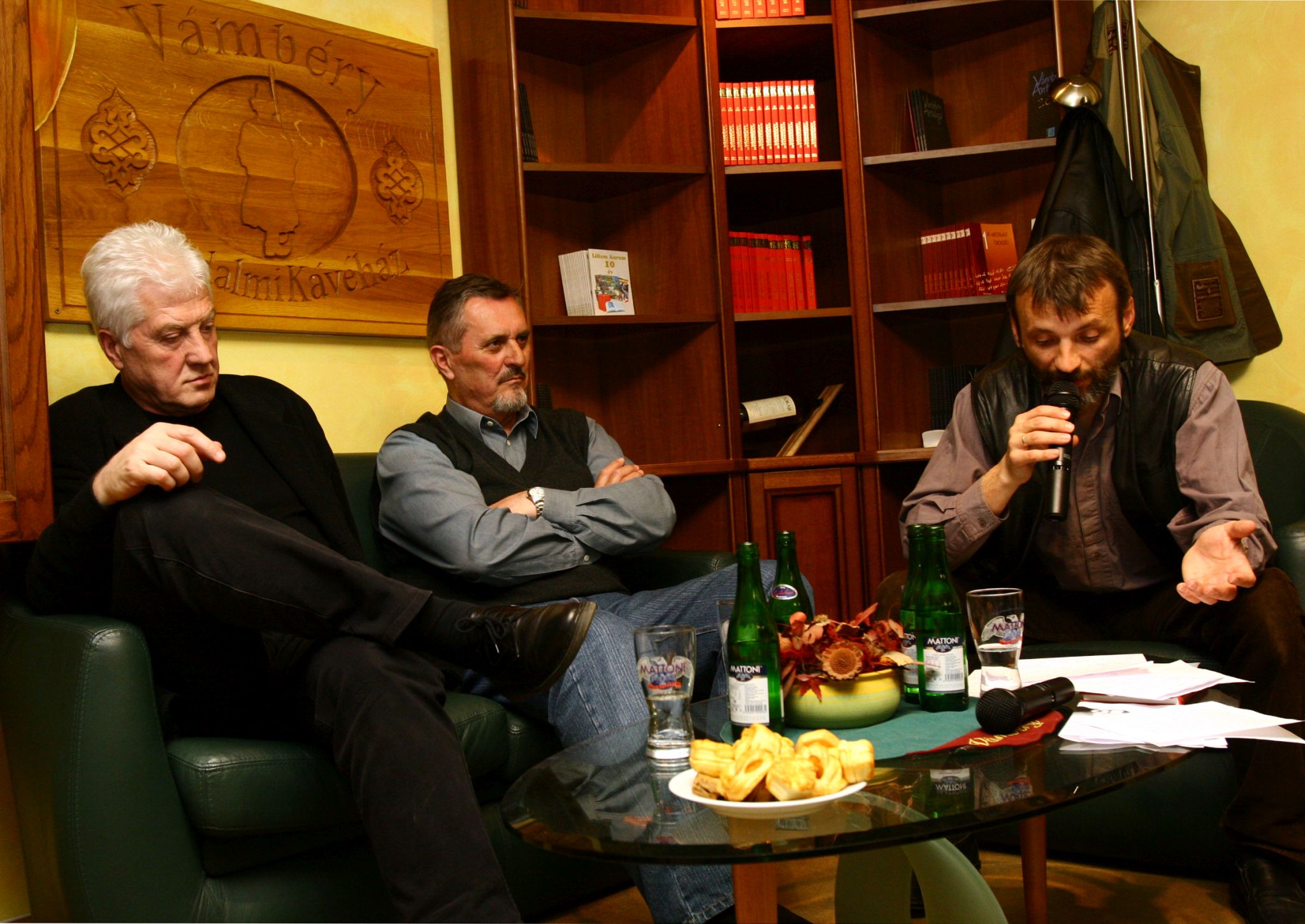 Bereck József Meseenciklop, avagy a foltozóvarga című könyvének bemutatója a Vámbéryben. A képen Csaplár Vilmos, Bereck József és Csanda Gábor.