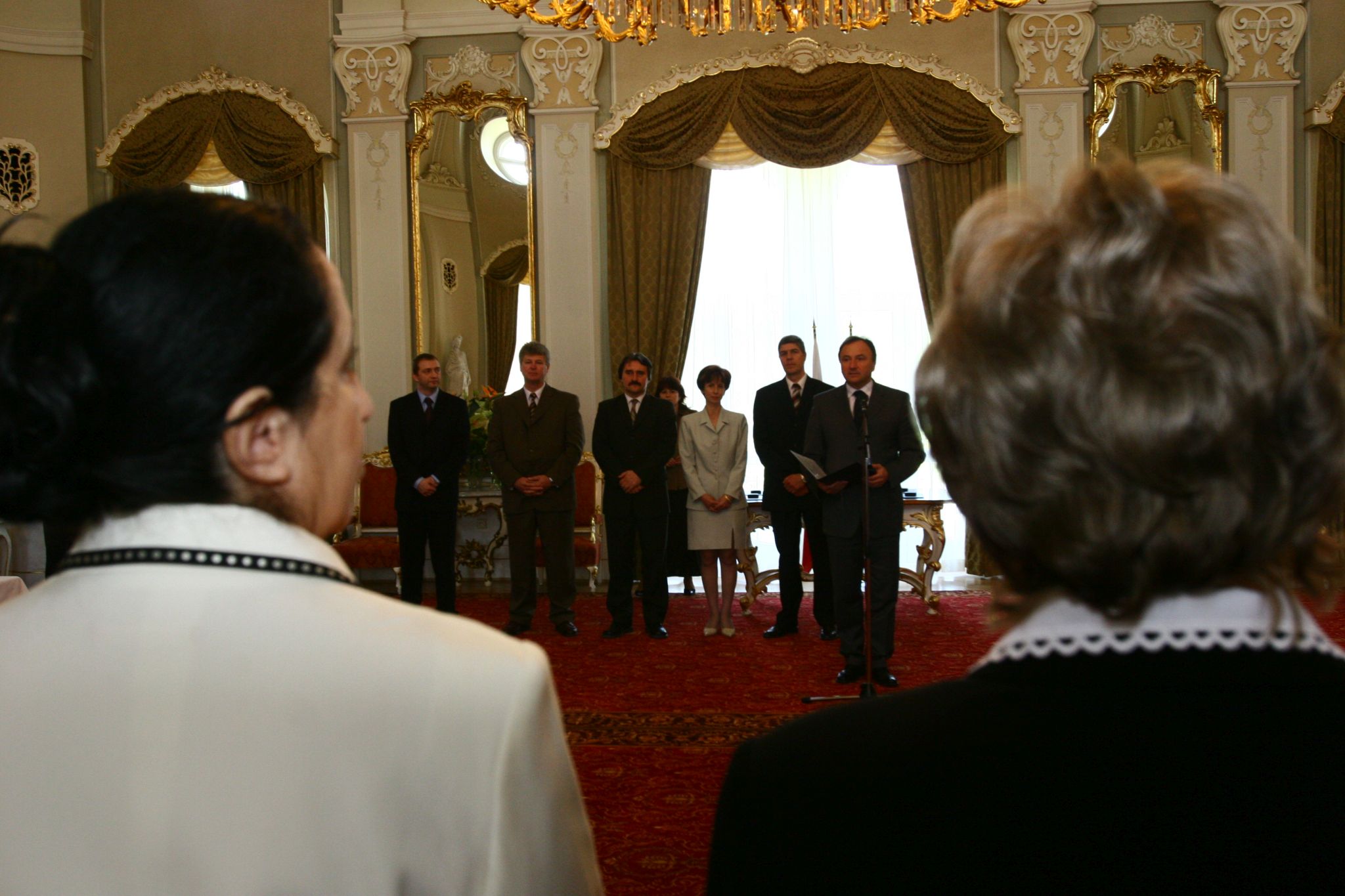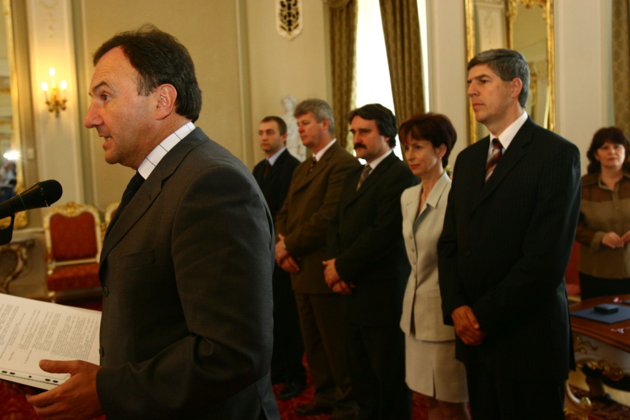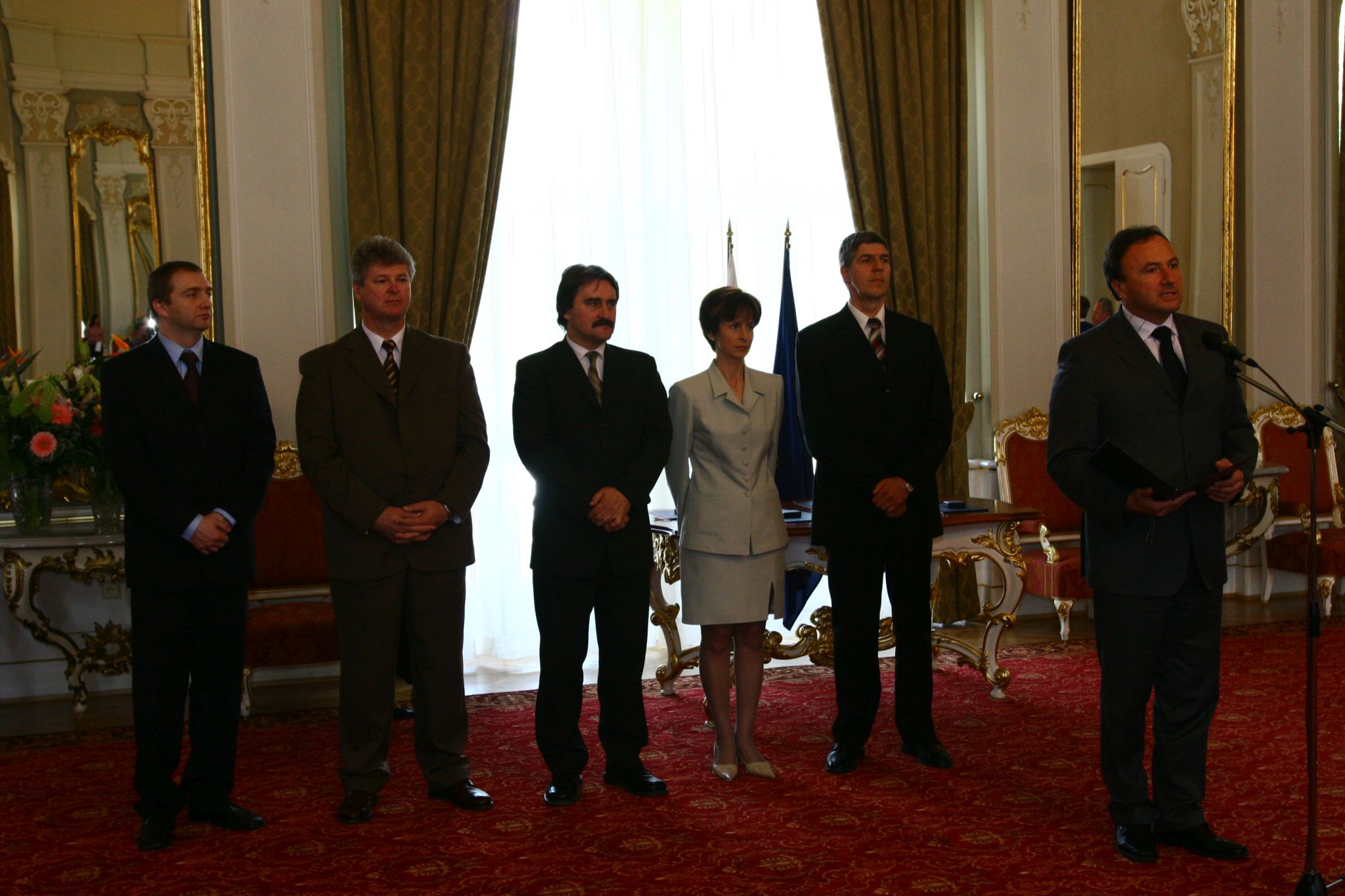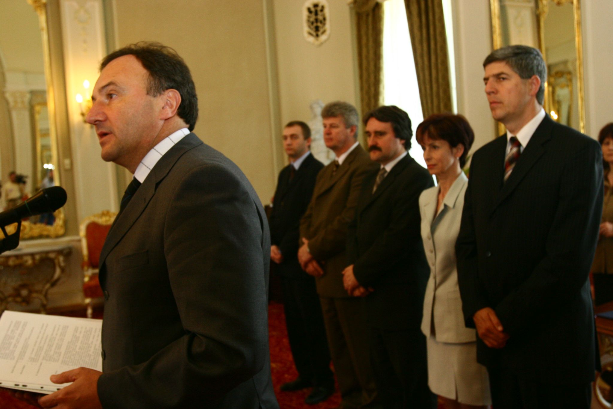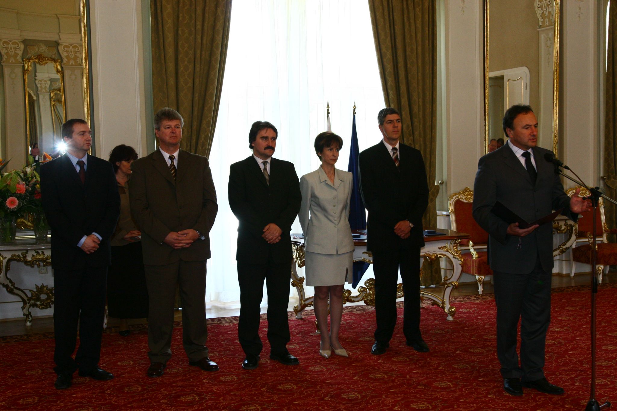 Csáky Pál beszédet mond a Szlovák Köztársaság Emlékplakettjának átadásán. A háttérben Bugár Béla és Bárdos Gyula.