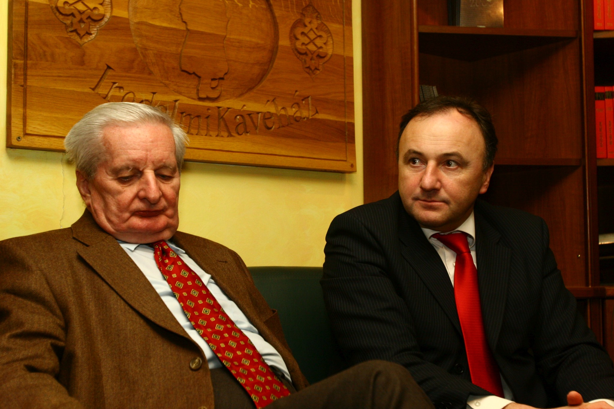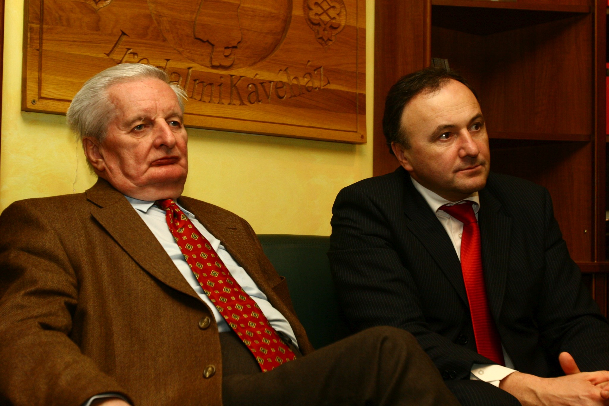 Csáky Pál Szabadulás a lángsírból című könyvének bemutatója a Vámbéryben. A képen Pomogáts Béla és Csáky Pál.