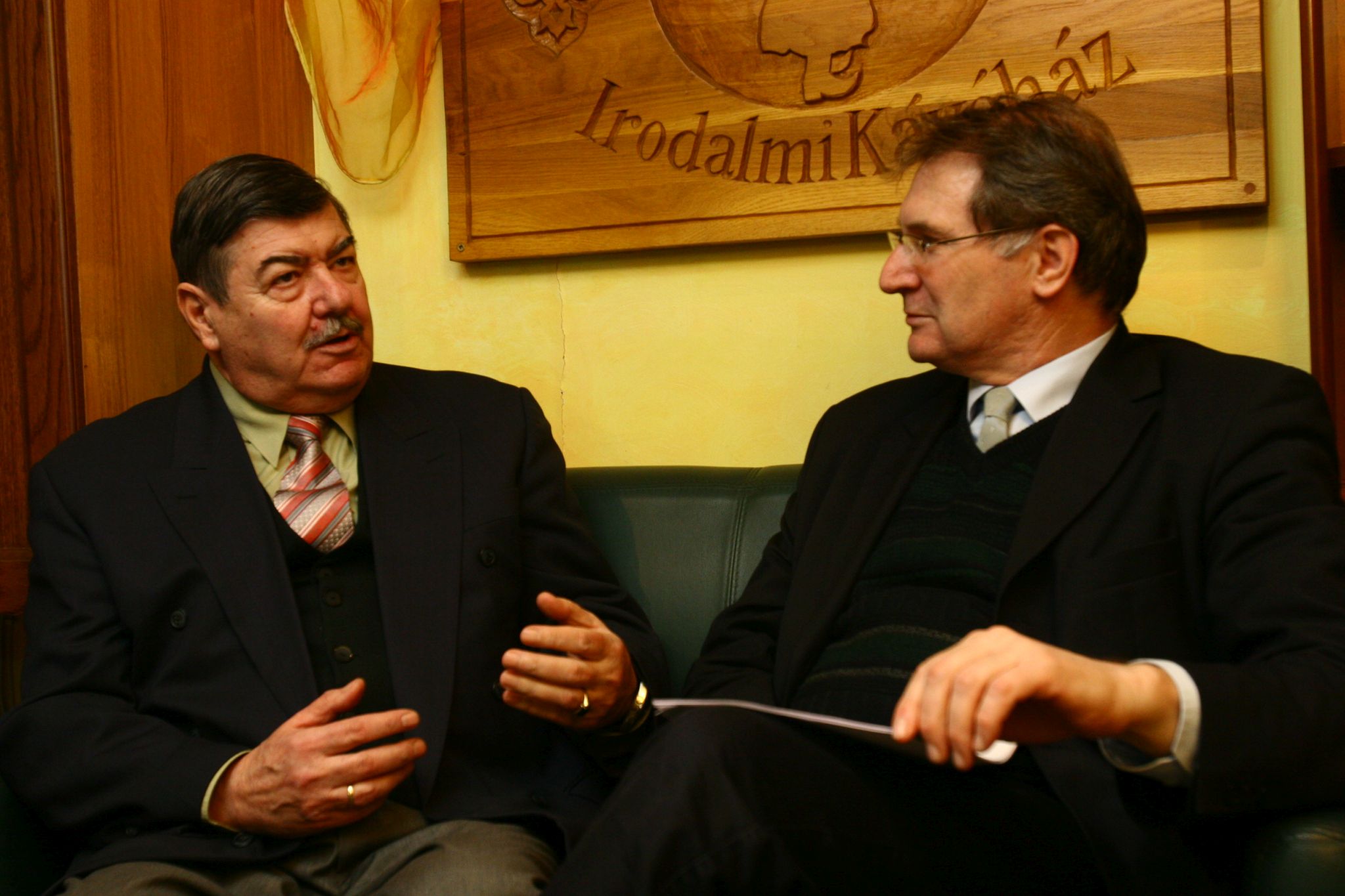 Csicsay Alajos Mérföldkövek ködben című könyvének bemutatója a Vámbéryben. A képen Csicsay Alajos és Szarka László.