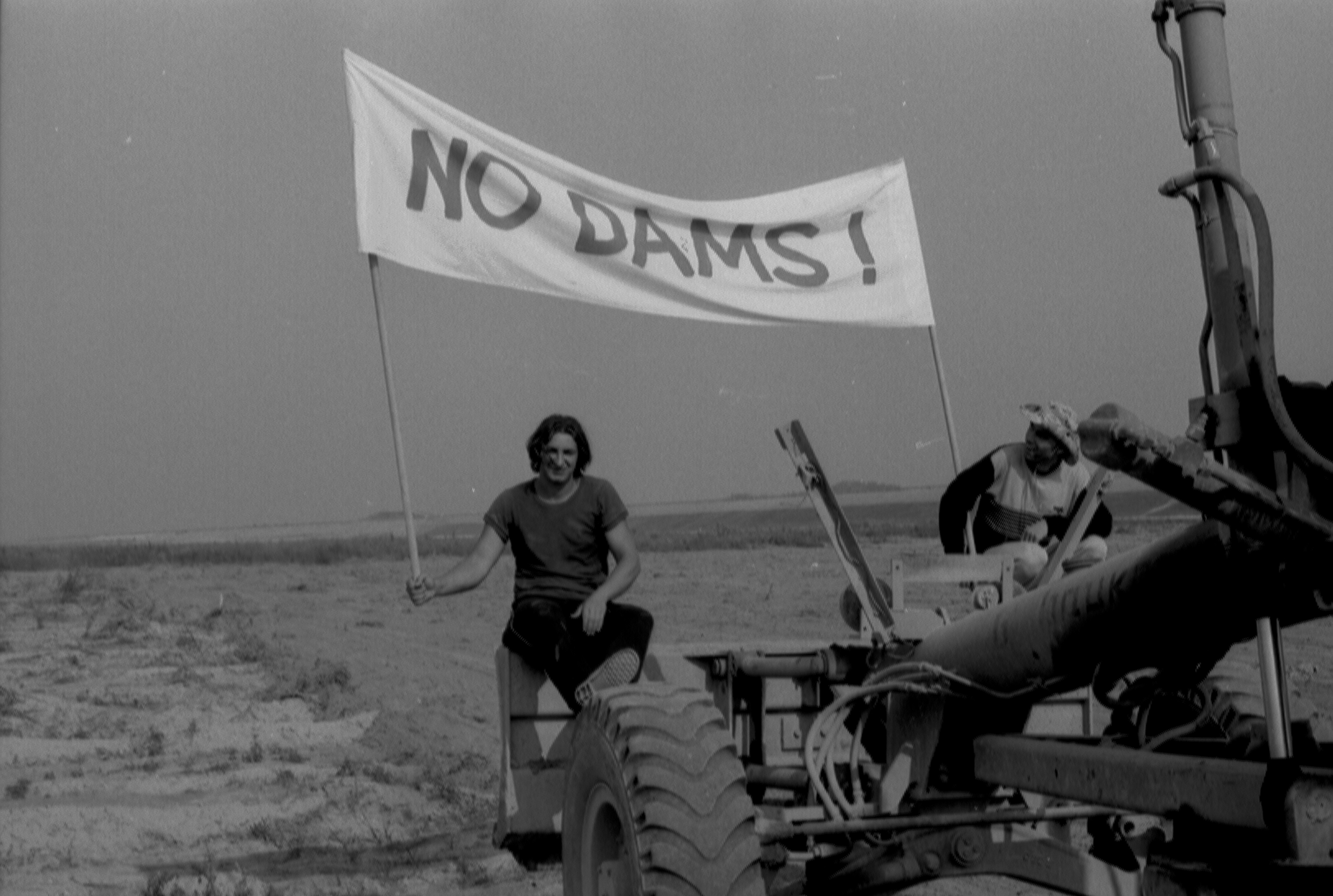 Demonstráció a bősi vízlépcső építése ellen. A zászlót Kmotrik Péter tartja.