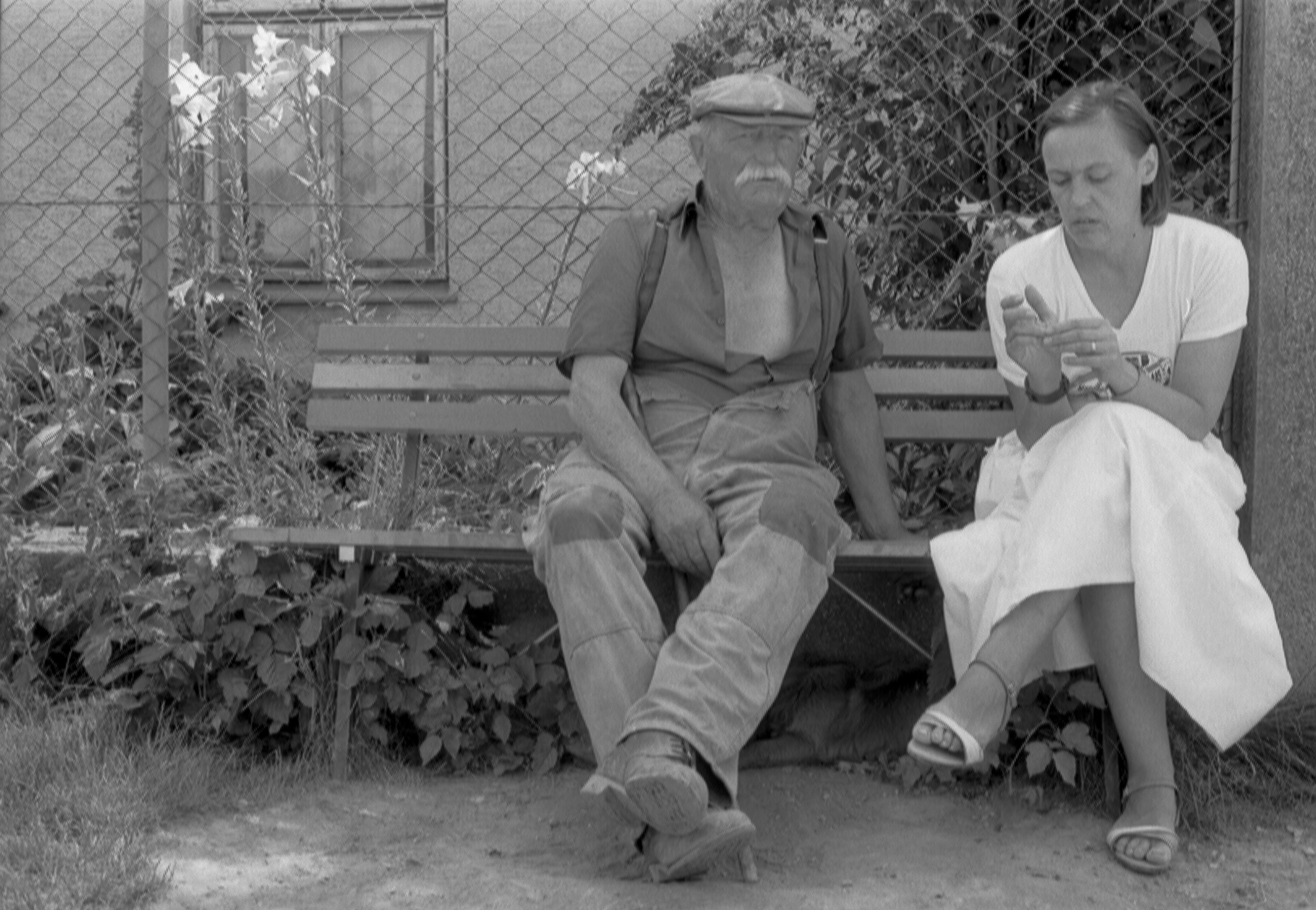 Demonstráció a bősi vízlépcső építése ellen. N. Gyurkovics Róza helyi lakossal beszélget.