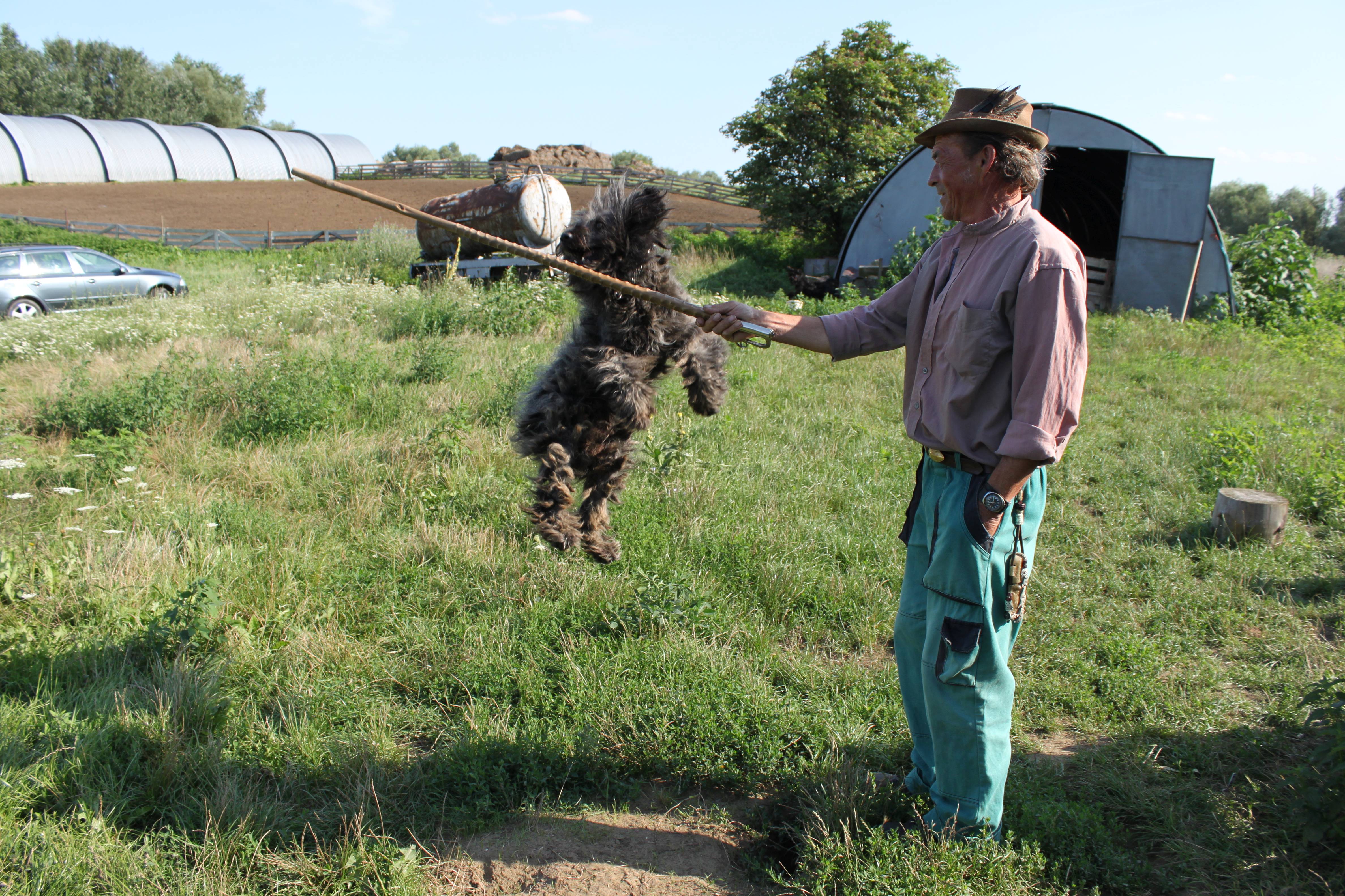 Dobcsák János kampóval tanítja a kutyát, ” fogni”.
