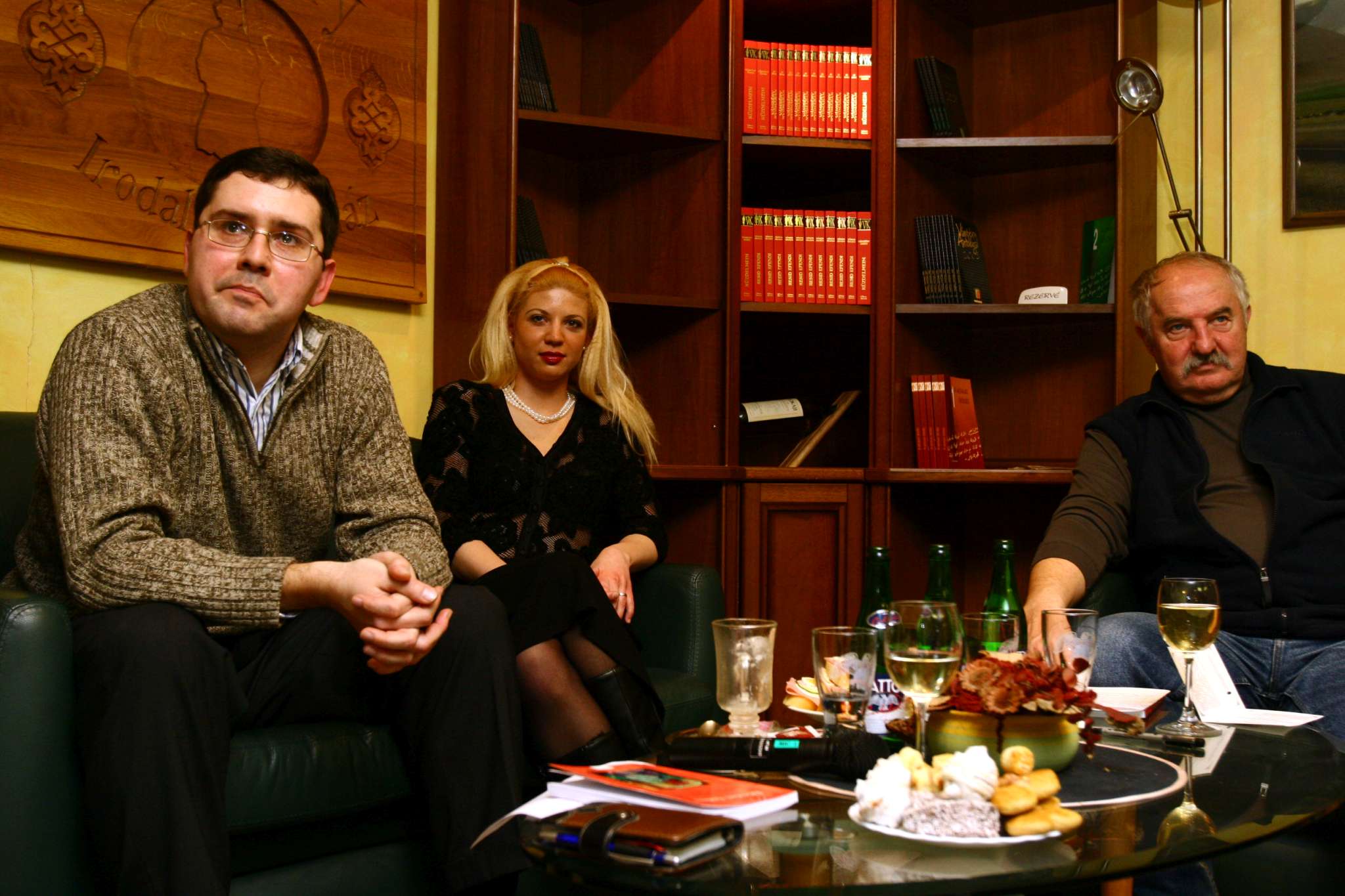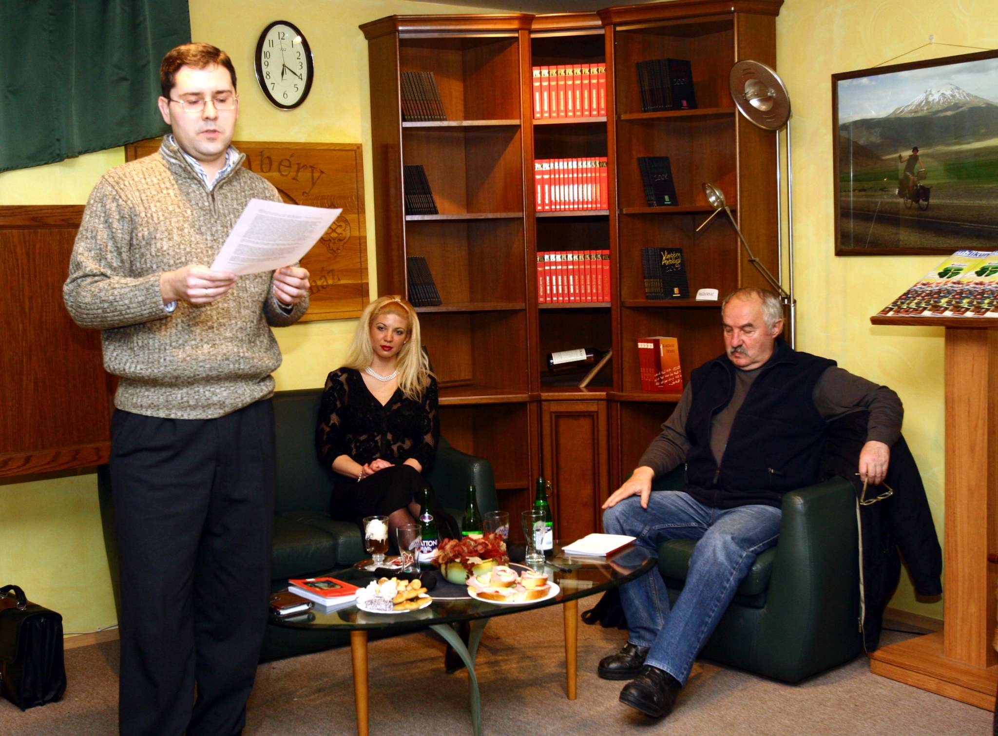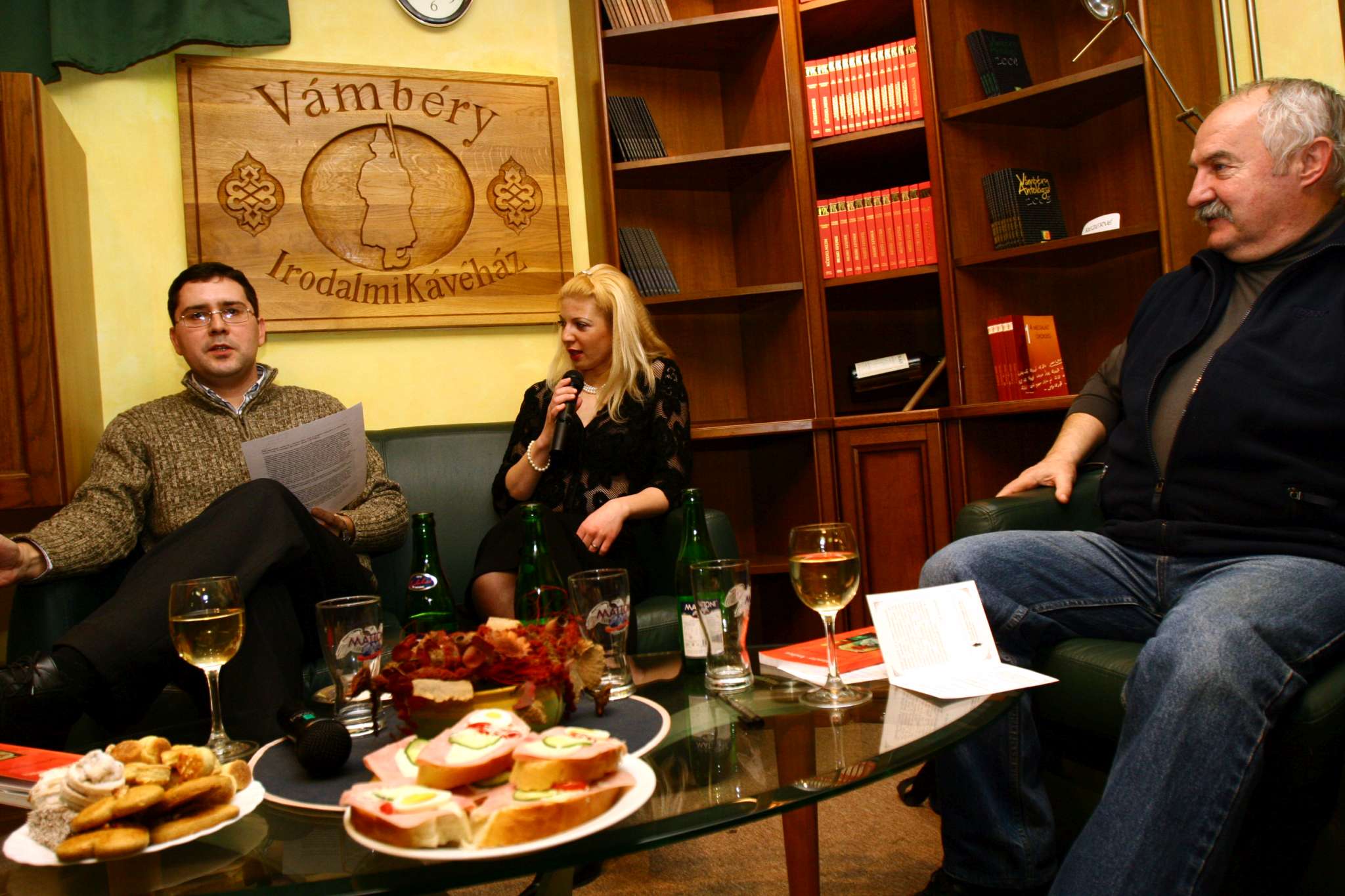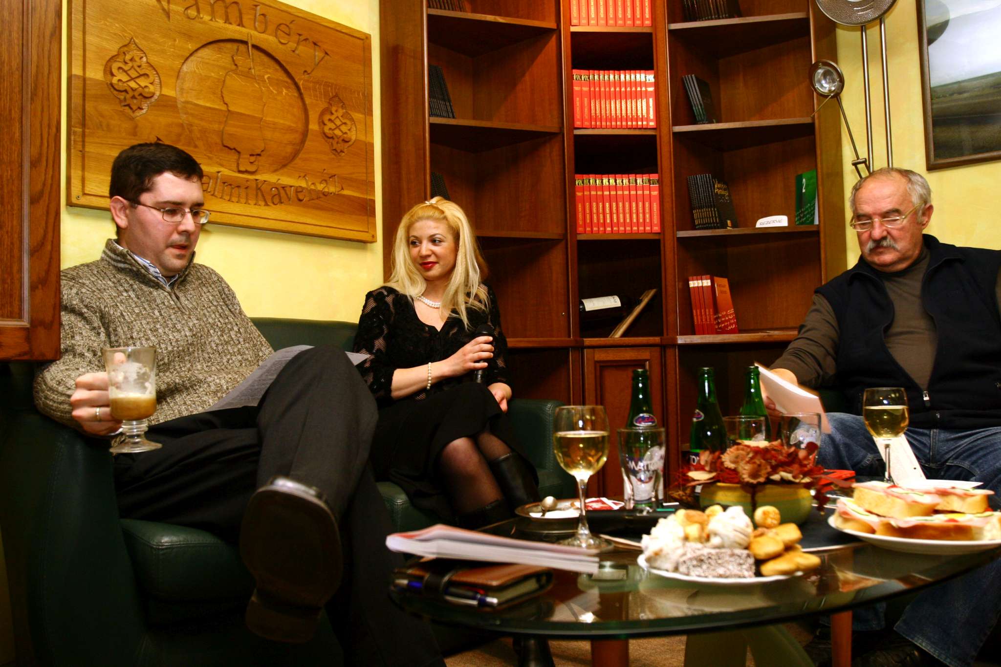 Dömény Andrea Szúrja namaszkara című könyvének bemutatója a Vámbéryben. A képen Vajda Barnabás, Dömény Andrea és Zirig Árpád.