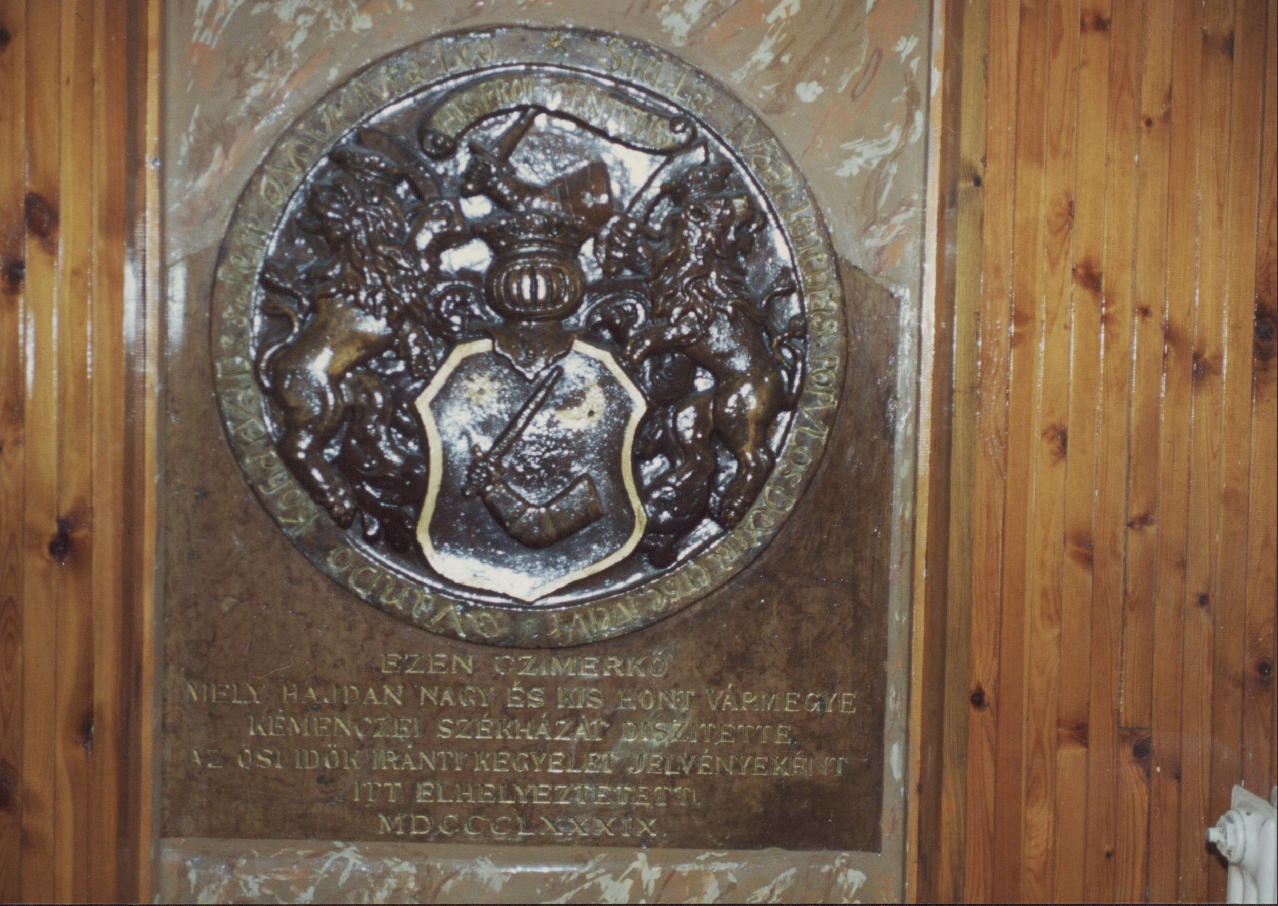 Emléktábla a Városháza épületében (Ezen czímerkő, mely hajdan Nagy és Kis Hont Vármegye Kemenczei székházát díszítette. Az ősi idők iránti kegyelet jelvényeként itt elhelyeztetett. MDCCC_XXXIX)
