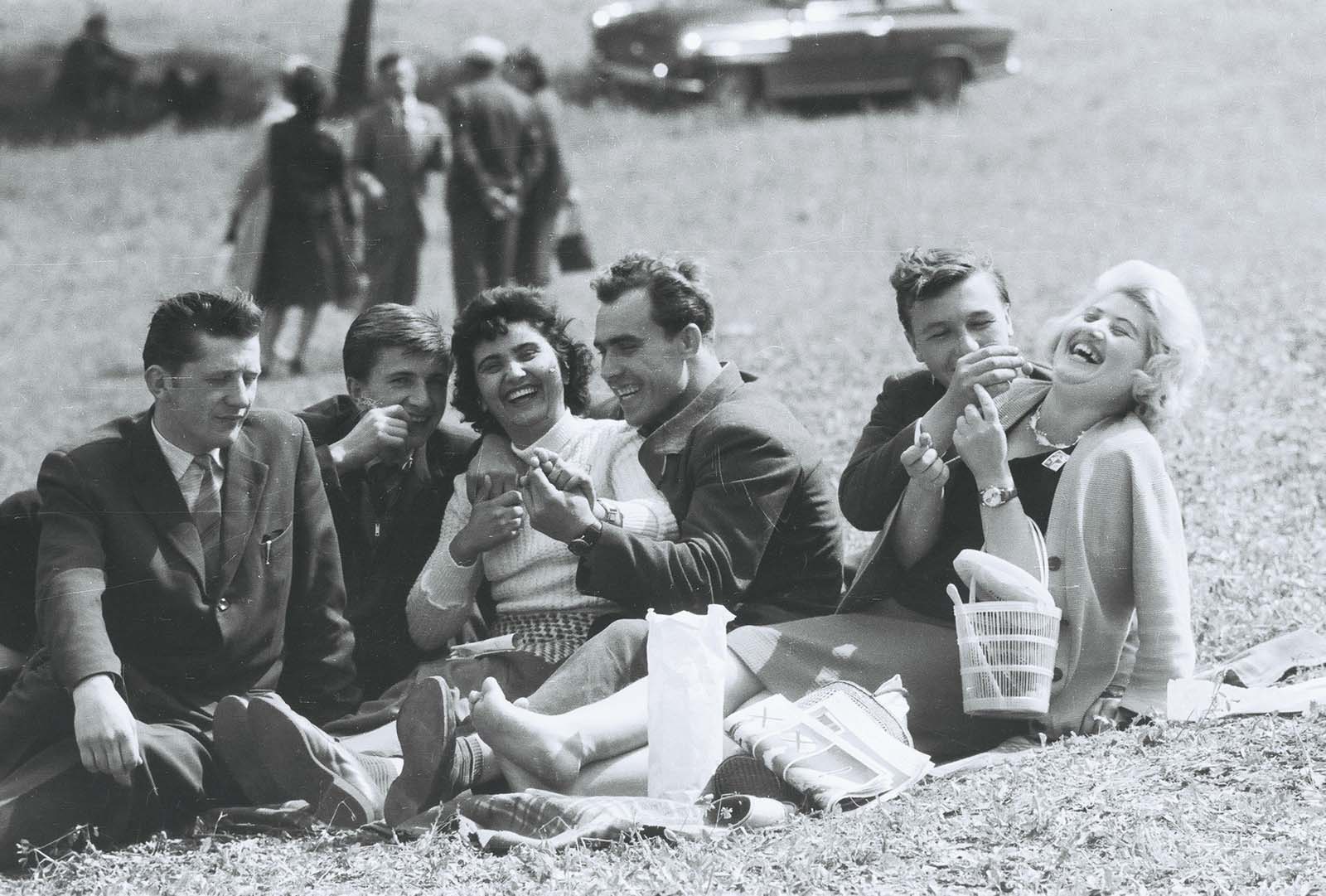 Fűben ülő fiatalok csoportja. (VII. Országos Dal- és Táncünnnepély)