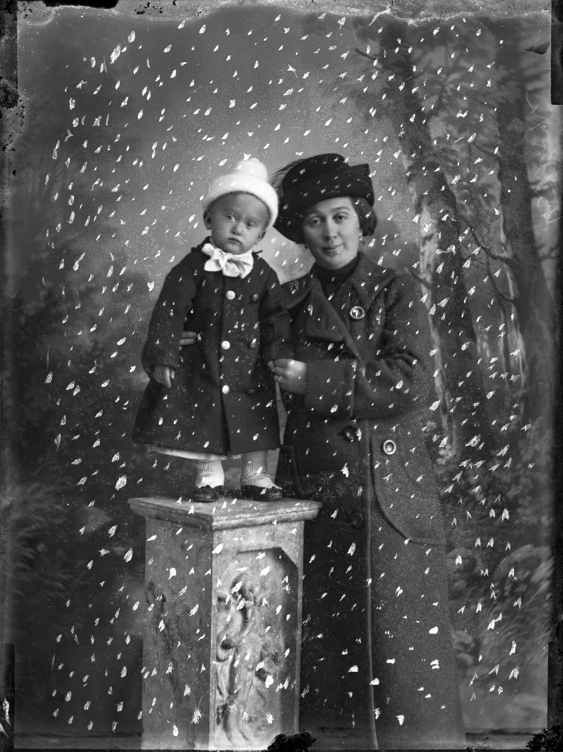 Hölgy és gyerek portré Komáromból, utólag festett hóeséssel. (digitalizált üveg)