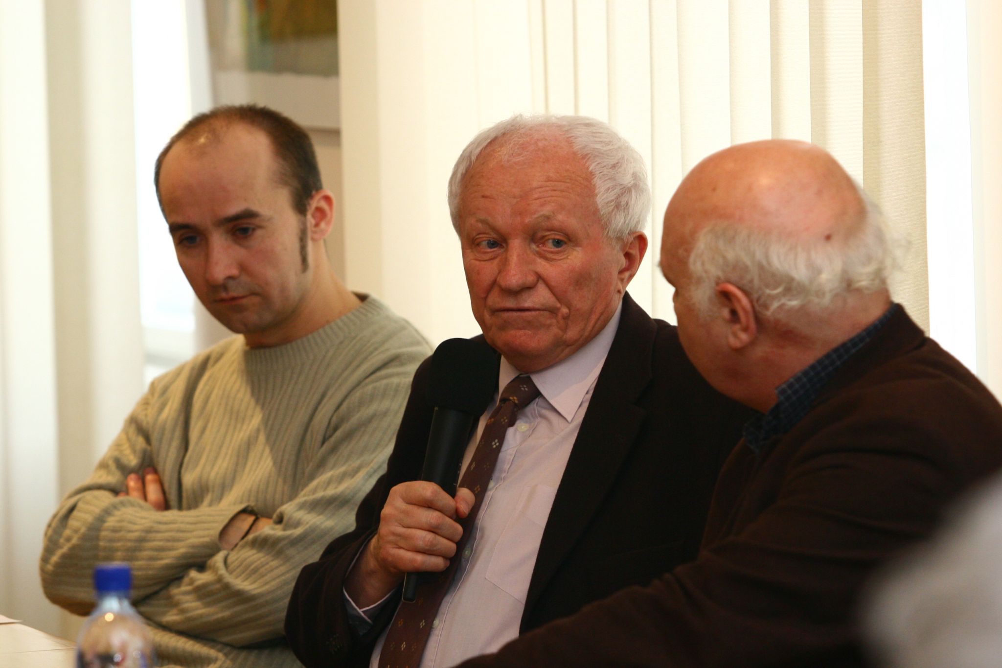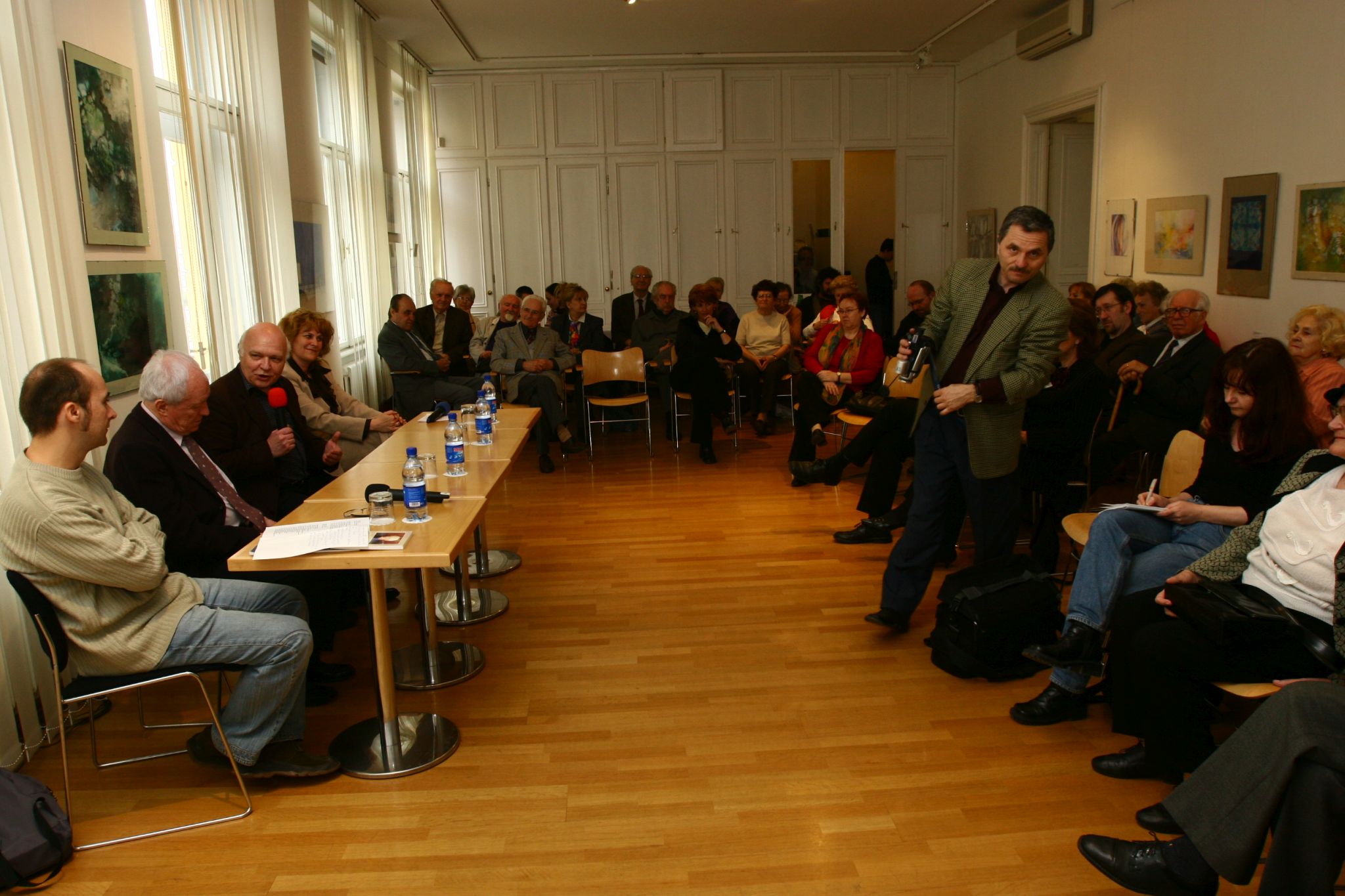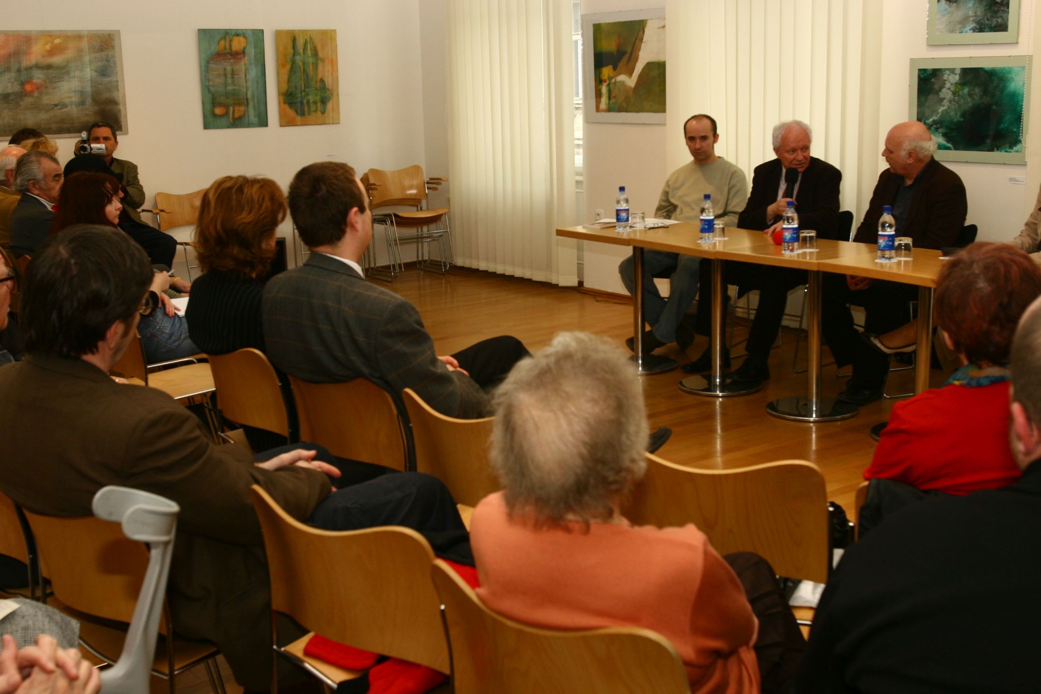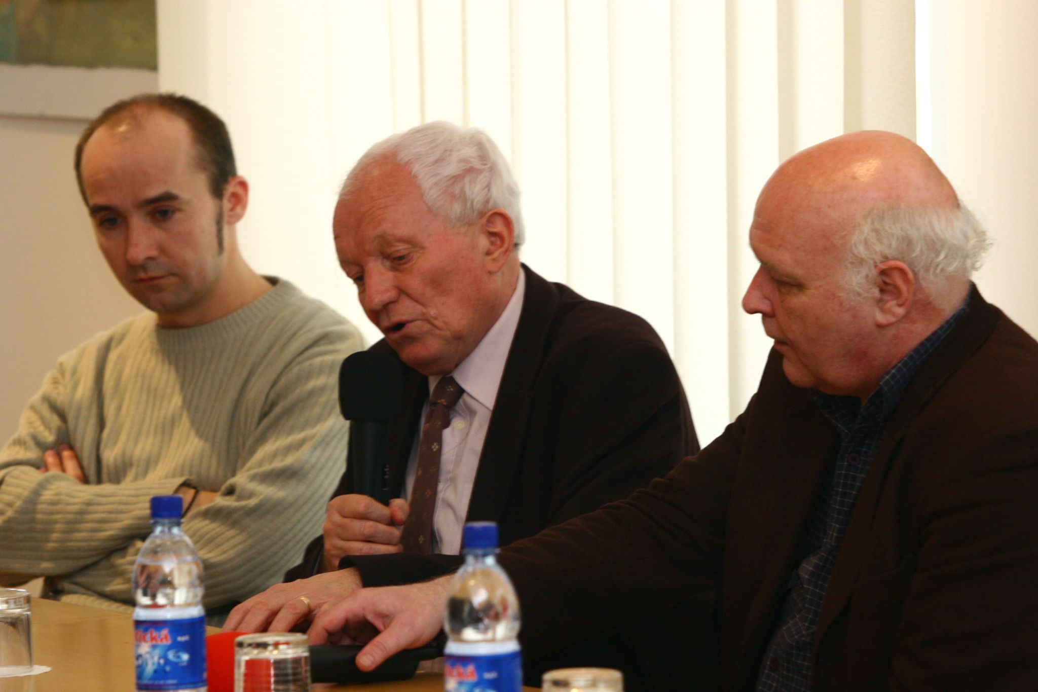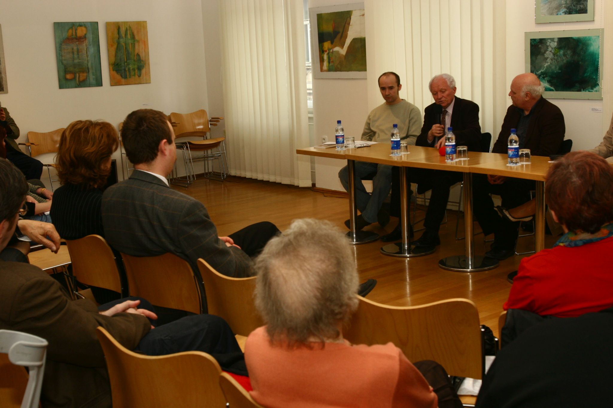 Irodalmi est Kalász Mártonnal. Az asztalnál Németh Zoltán, Kalász Márton és Grendel Lajos.