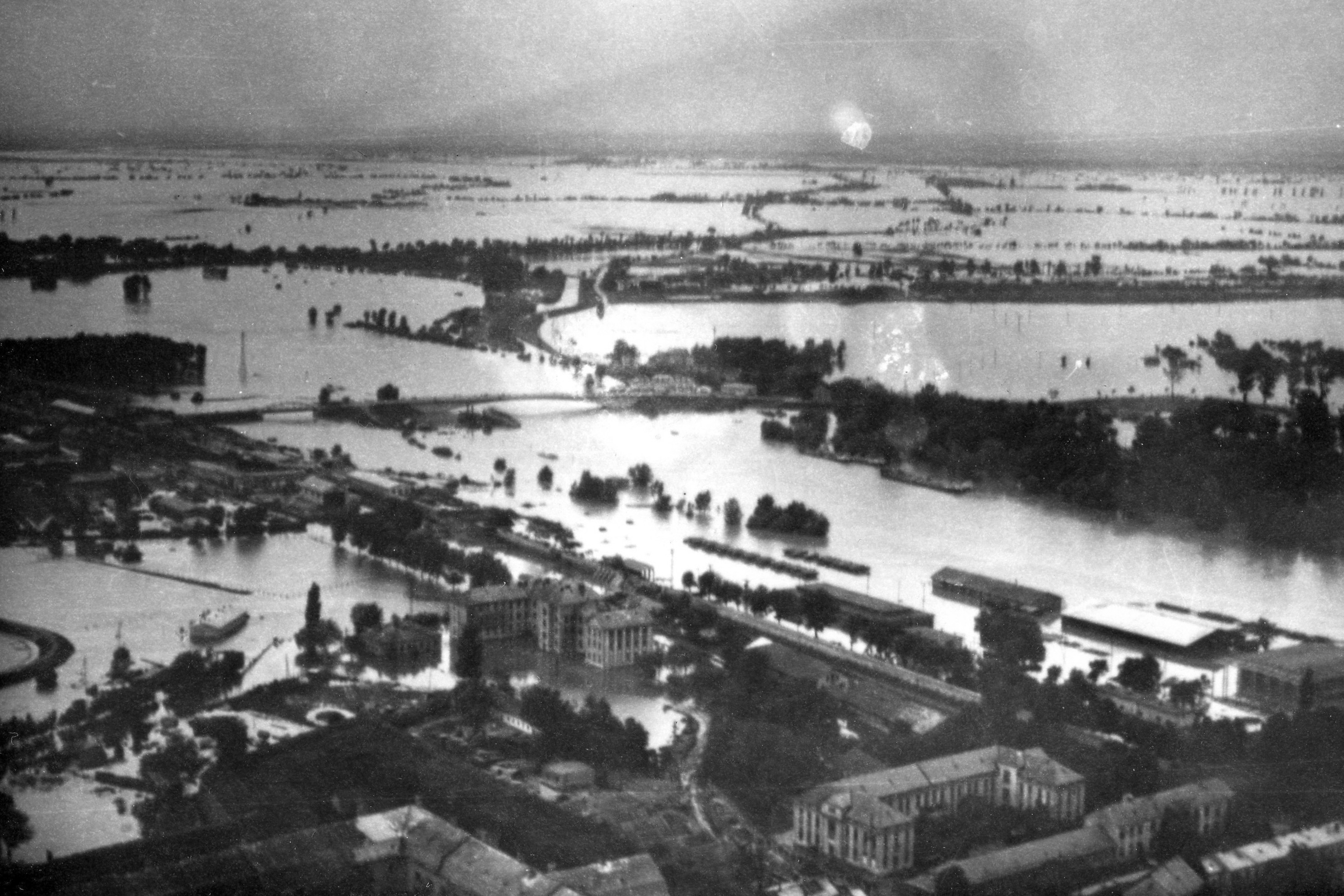 Komáromi Vágduna híd és rakpartja az árvíz alatt.