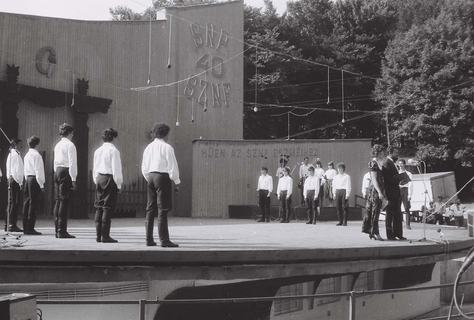 Konferálás (a mikrofonnál Dráfi Mátyás színész). Mögötte a Szőttes Népművészeti Csoport, Pozsony. (XXIX. Országos Kulturális Ünnepély)