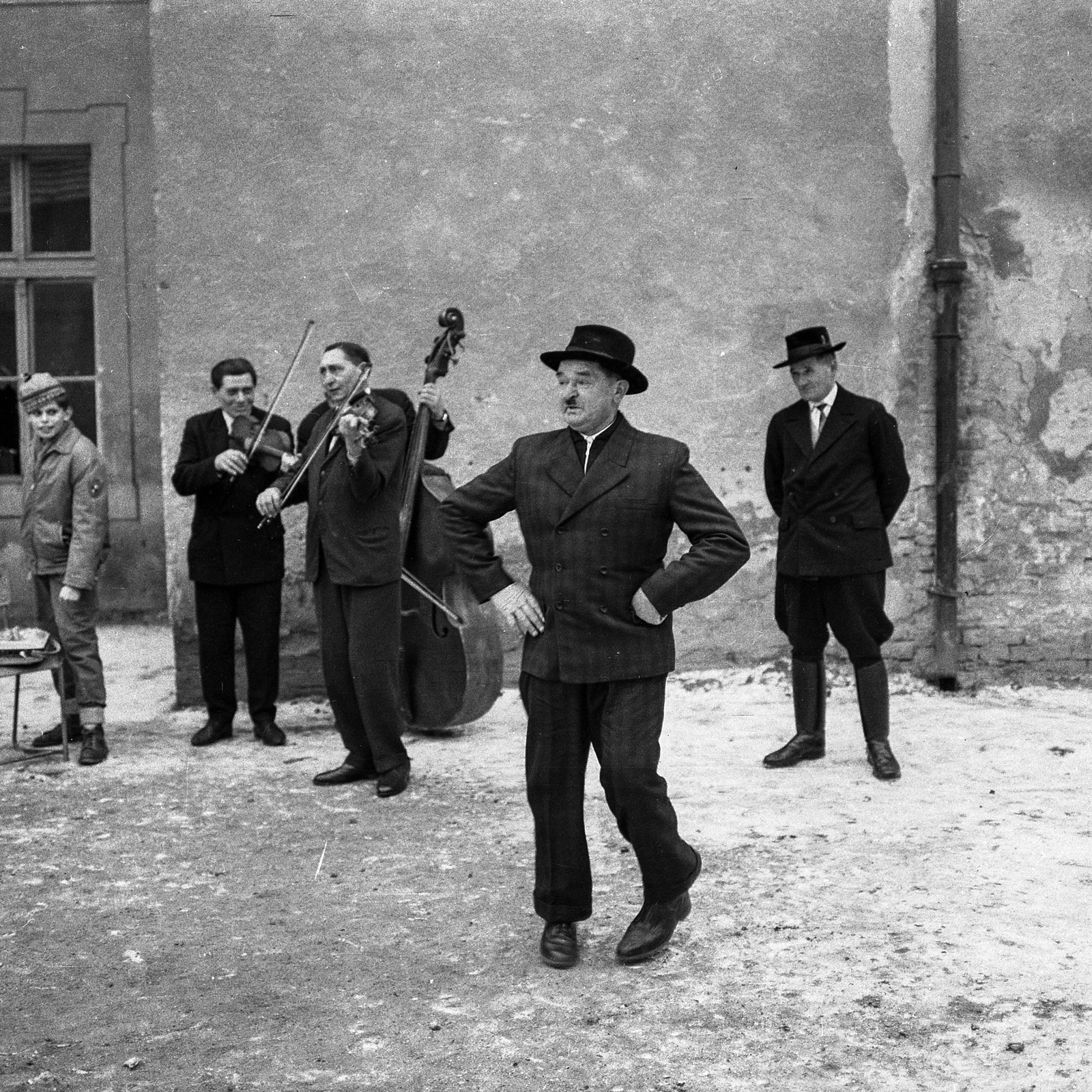 Megrendezett filmfelvétel a Csemadok által rendezett néptáncgyűjtő tanfolyam hallgatói részére. (A képen Balogh Gyula és Borbély István “Pistyúr”. A helyi cigányzenekar tagjai: Cirók Aladár – prímás, Lakatos József – nagybőgő, Farkas István – kontra. A hangfelvevőnél Éri Péter)