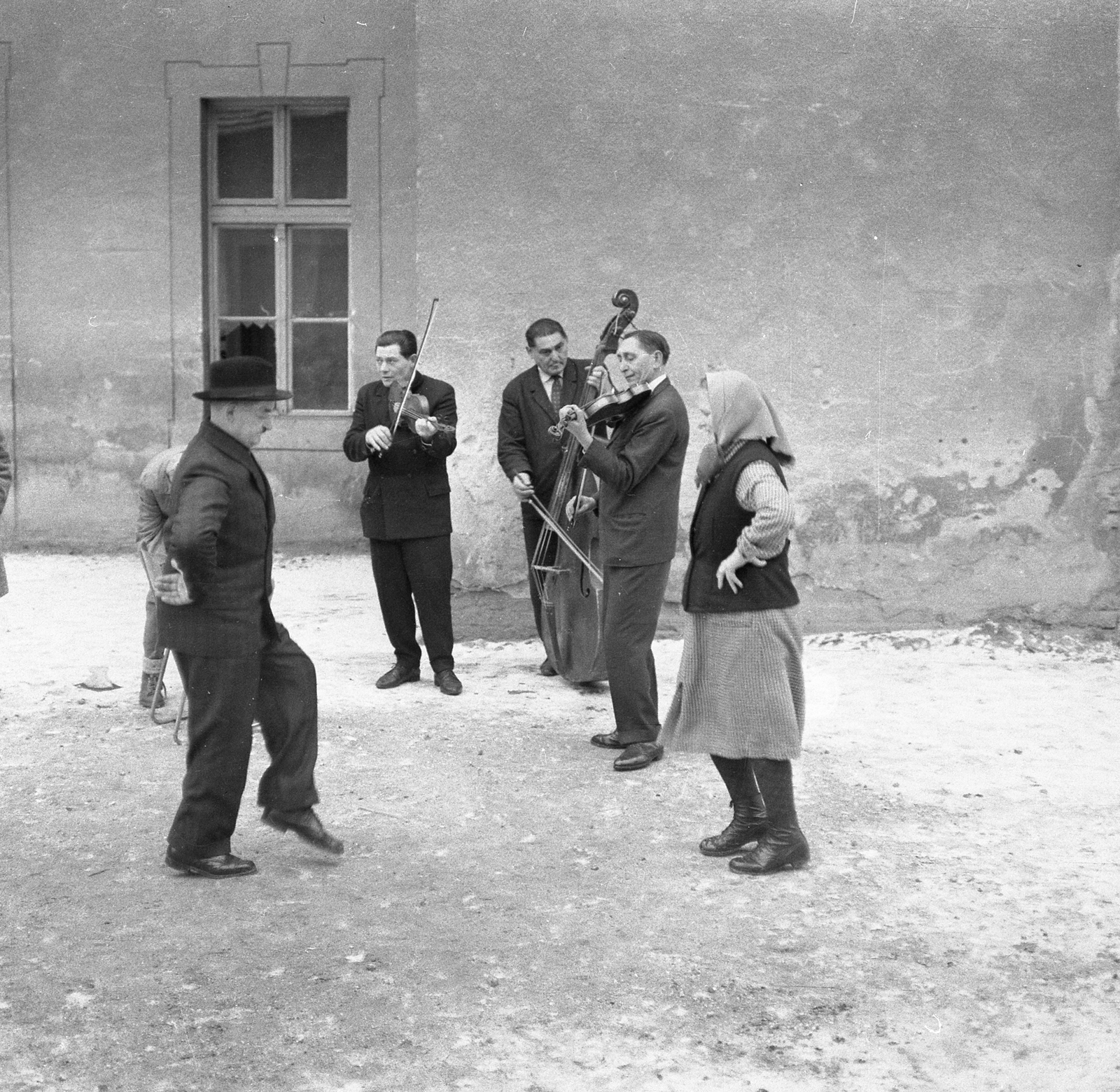 Megrendezett filmfelvétel a Csemadok által rendezett néptáncgyűjtő tanfolyam hallgatói részére. (A képen Balogh Gyula és Brenkus Veronika táncol. A helyi cigányzenekar tagjai: Cirók Aladár – prímás, Lakatos József – nagybőgő, Farkas István – kontra)