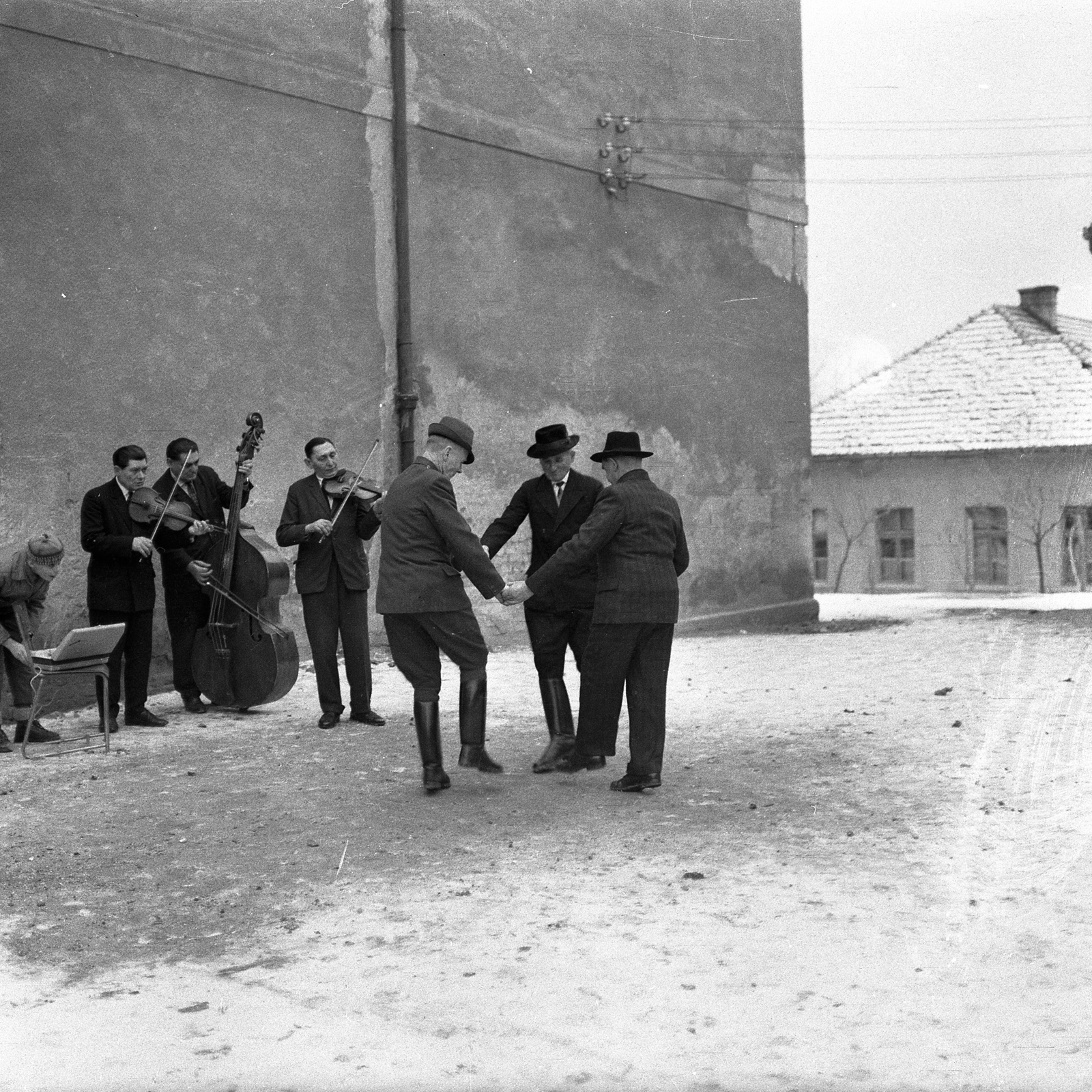 Megrendezett filmfelvétel a Csemadok által rendezett néptáncgyűjtő tanfolyam hallgatói részére. (szóló verbunk, Előadók: Balogh Gyula, Borbély István “Pistyúr”, Borbély István “Slokota”)
