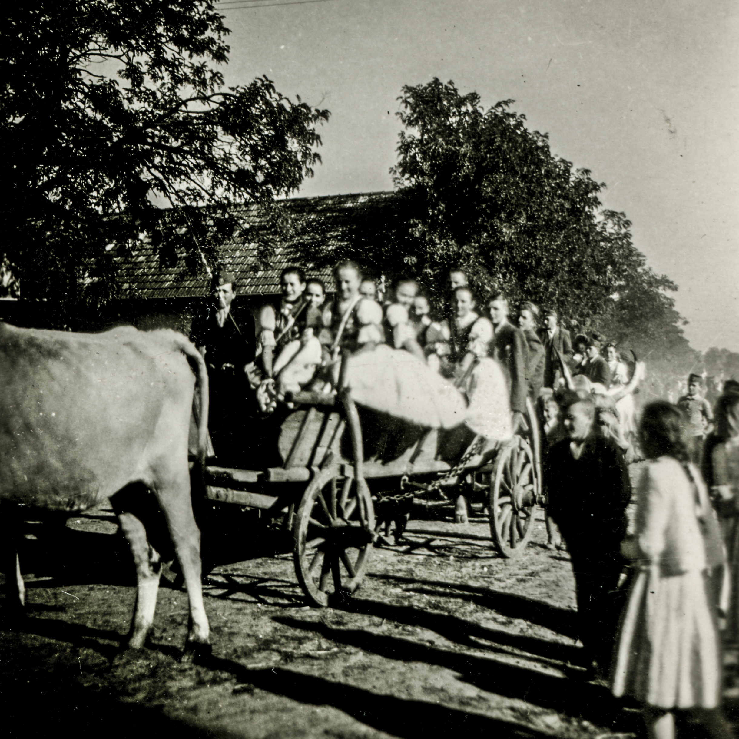 Népviseletes lányok ökörszekéren.