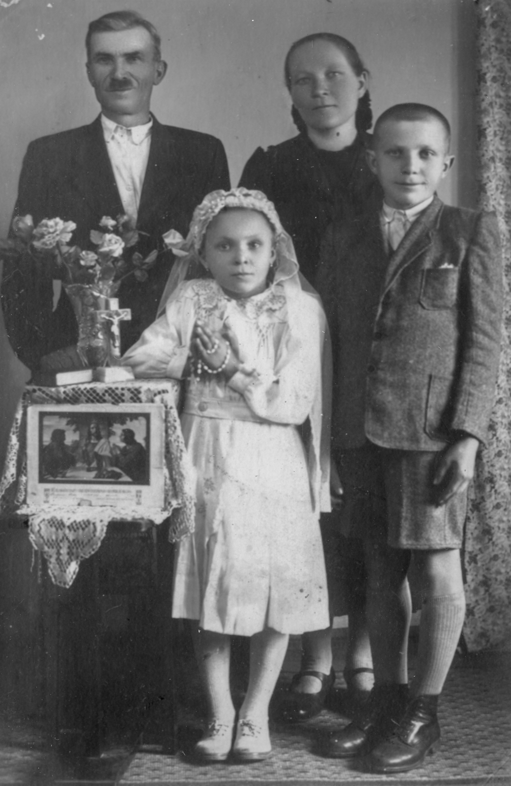 Récsei István (szül. 1904) Récseiné Szalma Erzsébet (szül. 1912) Récsei Ferenc (szül. 1937) Harangozóné Récsei Ilona (1940) – Elsőáldozás alkalmából Zselízen (Budaváry Fényképészet)