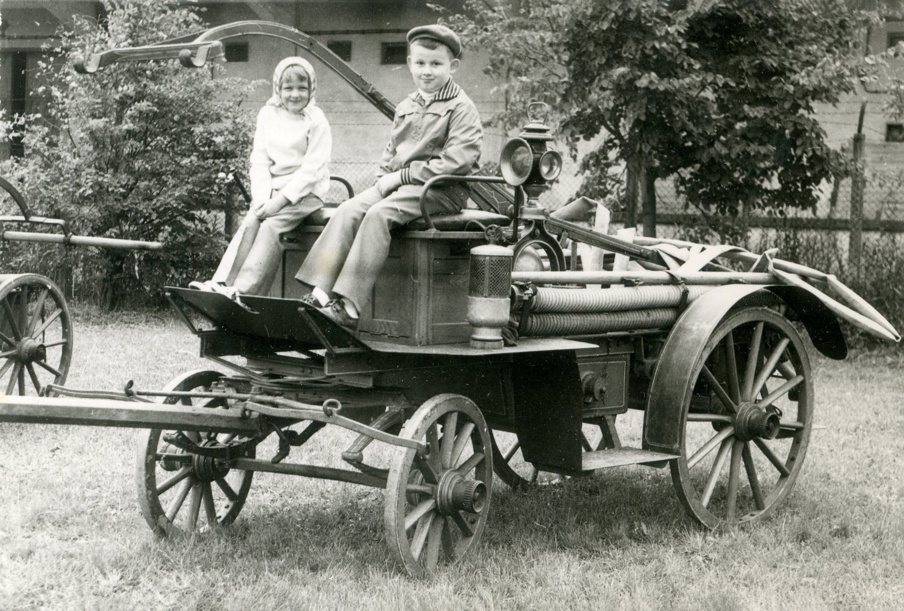 Régi tűzoltó kocsin ülő gyerekek