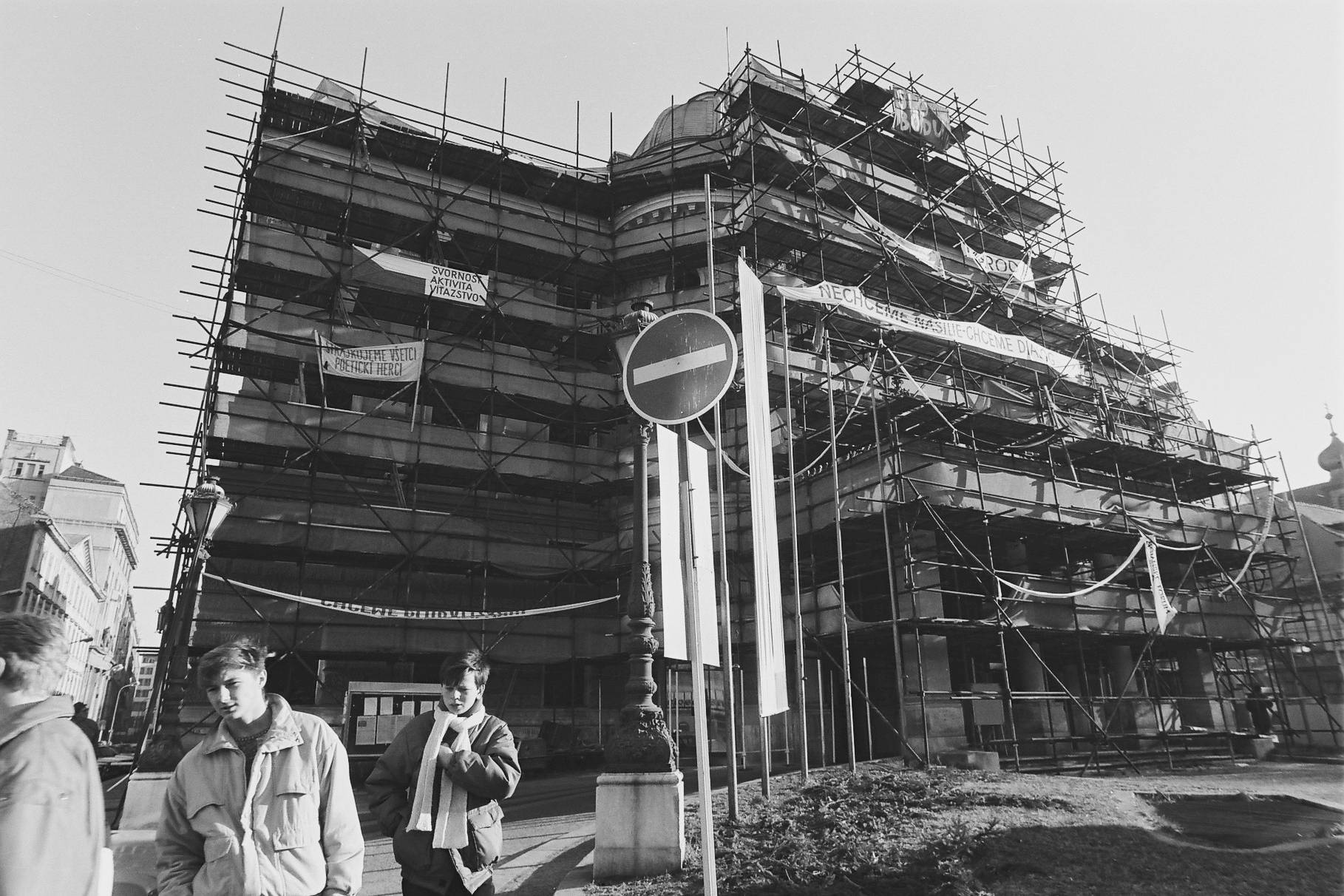 Rendszerváltás Pozsonyban. Transzparansek a Szlovák Nemzeti Színház épületén.