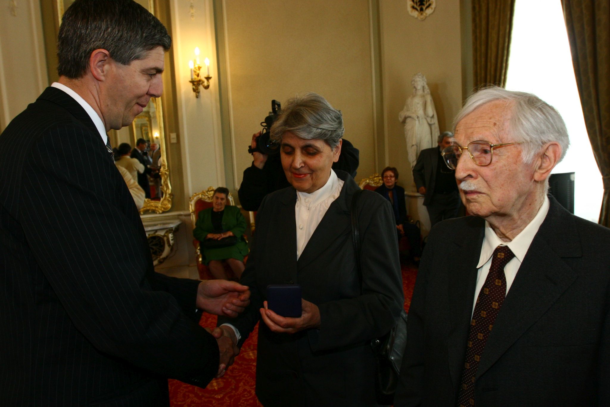 Szlovák Köztársaság Emlékplakettjának átadása. A képen Bugár Béla, Fukari Valéria és Hadsák Vilmos.