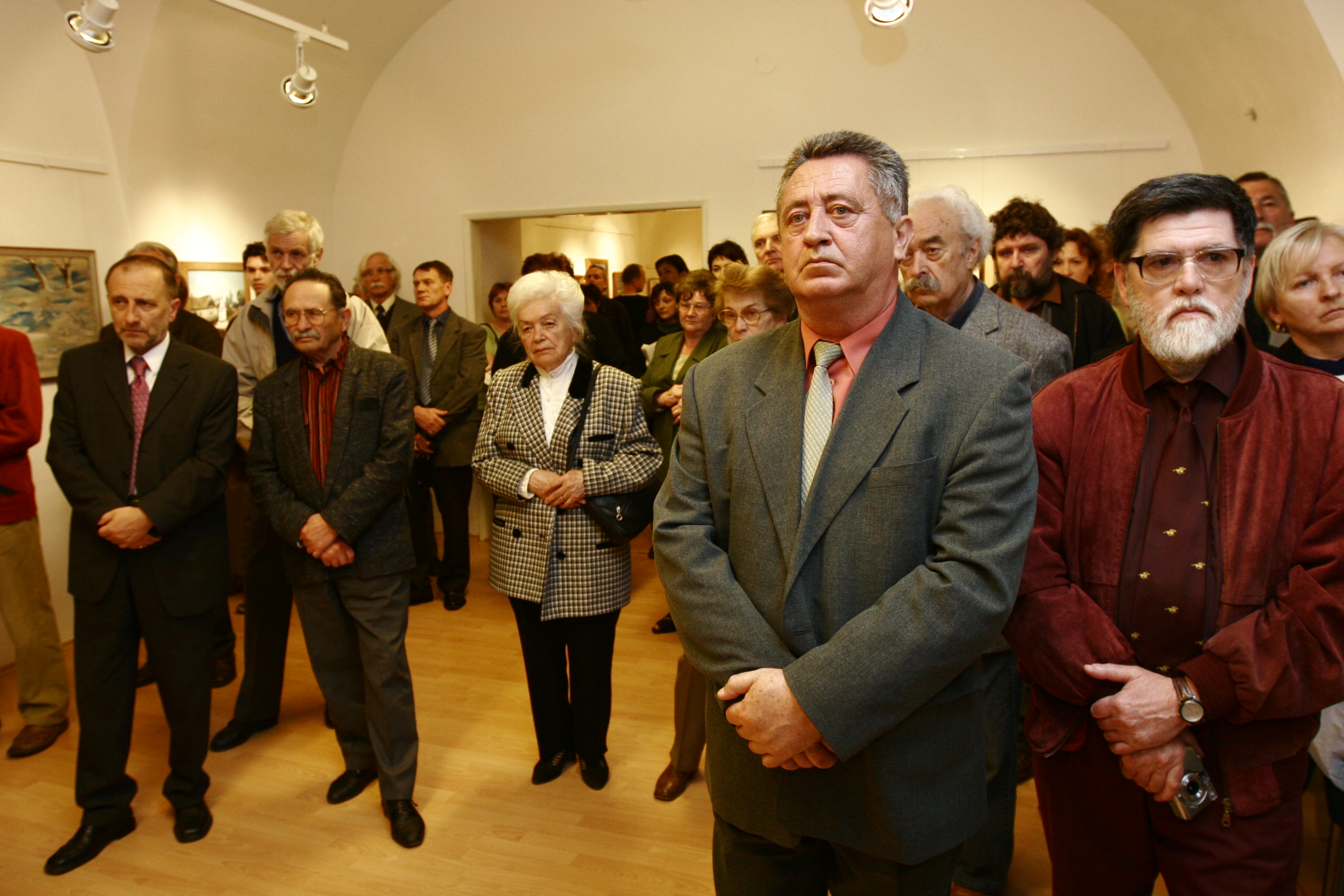Tallós Prohászka István képeinek kiállítása a Bramer-kúriában. A képen Bárdos Gábor, Takács András és Végh László.