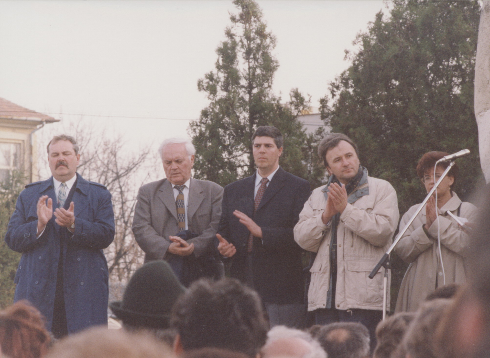 Tiltakozó gyűlés Bátorkeszi és Búcs iskolaigazgatóinak leváltása miatt (a képen Dobos László, Bugár Béla és Csáky Pál)