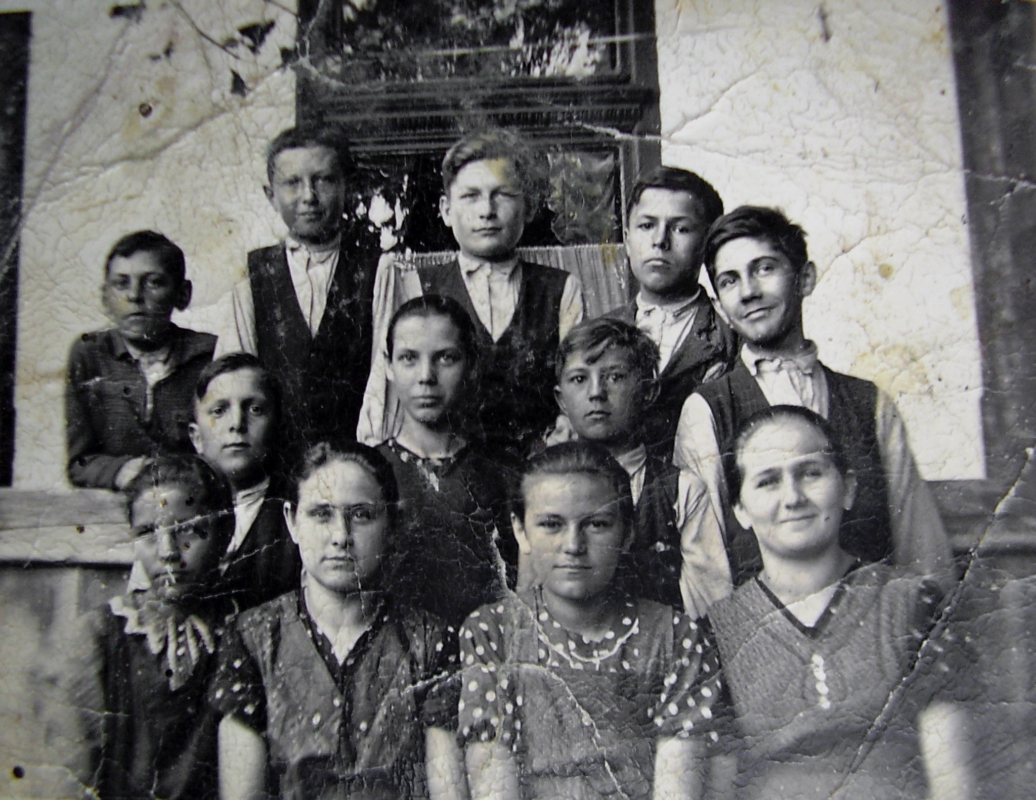 Tornagörgői fiatalok csoportképe. A képen Hanesz Mariska, Körtvély Klára, Szaniszló Ilona, Barta Mária, Agyagos József, Fekete János, Petri Pál és Körtvély István.