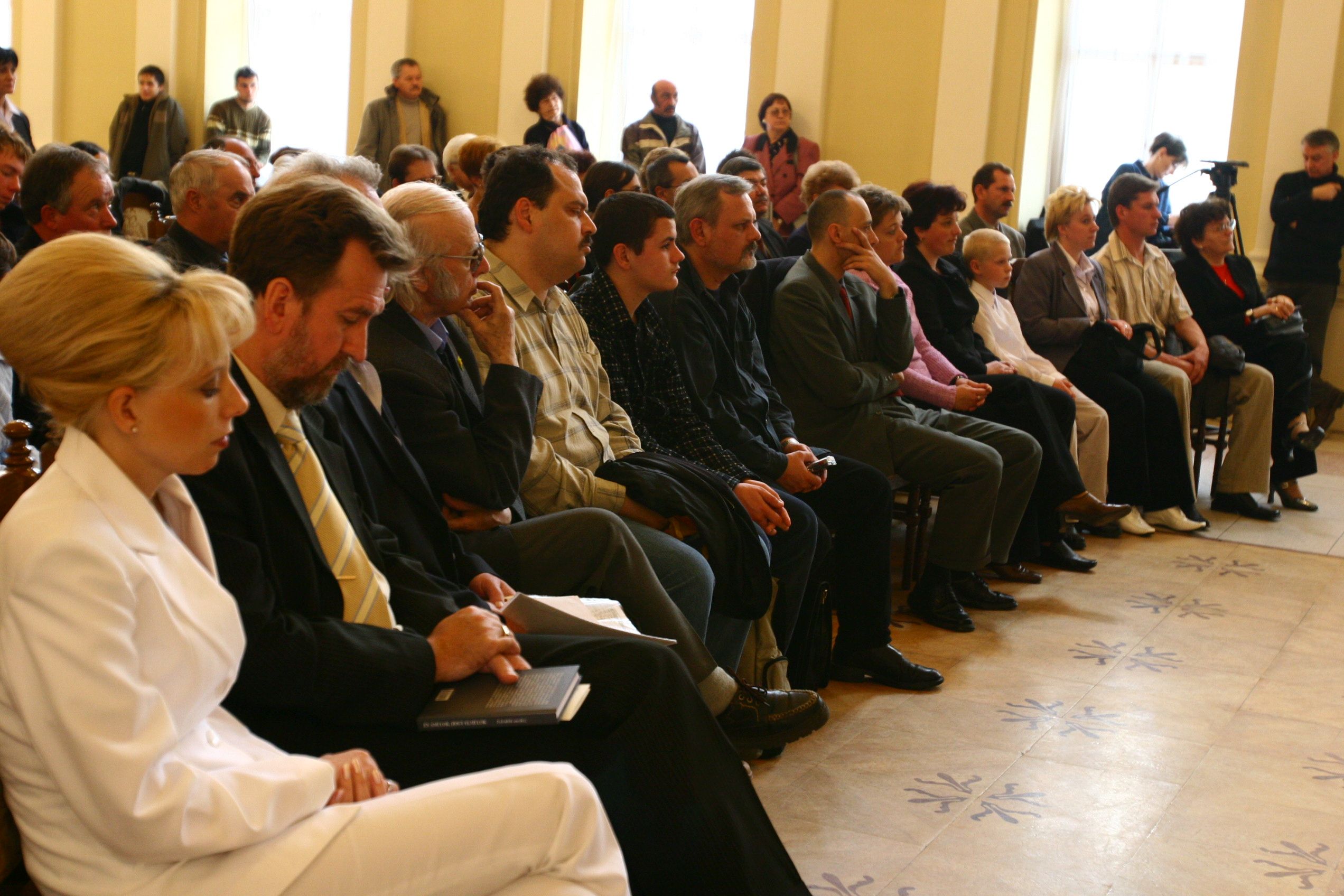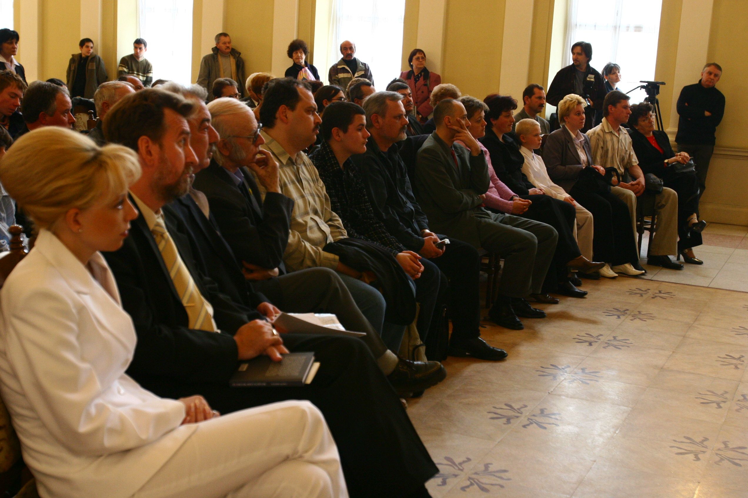Ünnepség és kiállításmegynitó József Attila születésének 100. évfordulóján. Az első sorban Hodossy Gyula és Tőzsér Árpád.