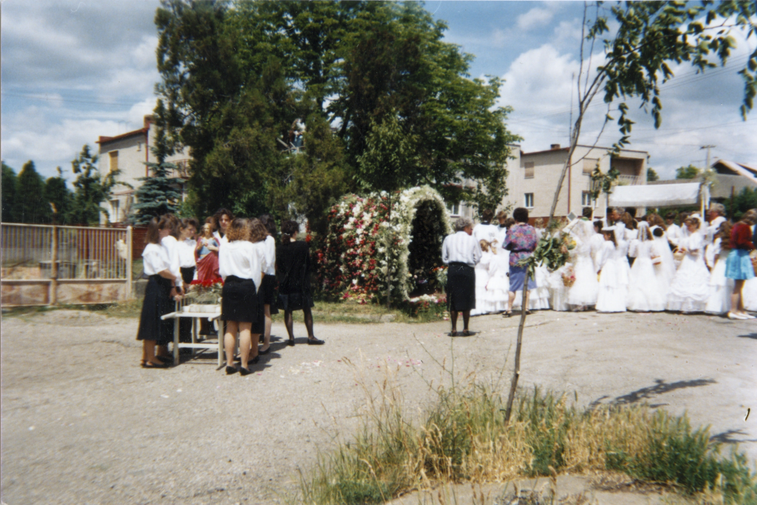 Úrnapi körmenet alkalmából épített virágsátor (szín), elsőáldozós leányokkal.