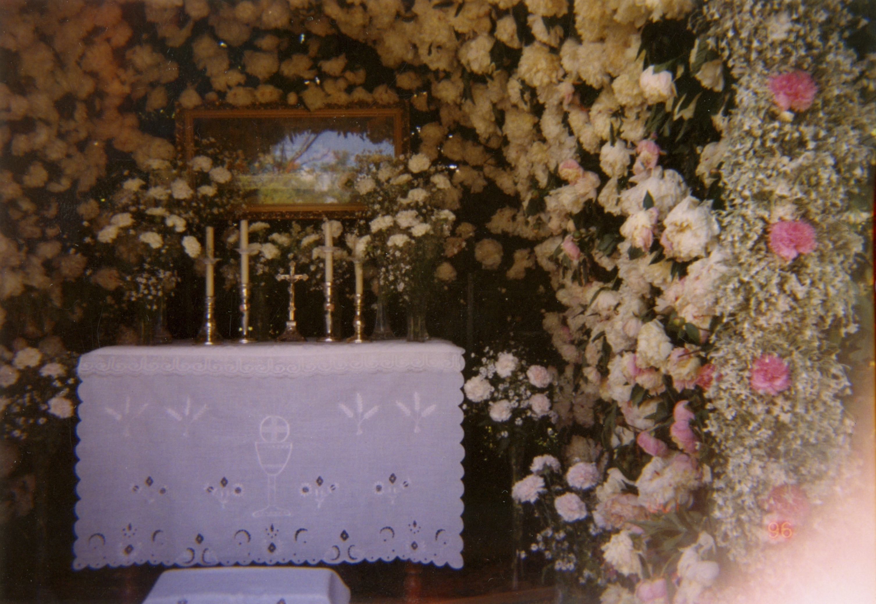 Úrnapi körmenet alkalmából készített virágsátor, másképpen szín a Szentháromságnál a 90-es években.