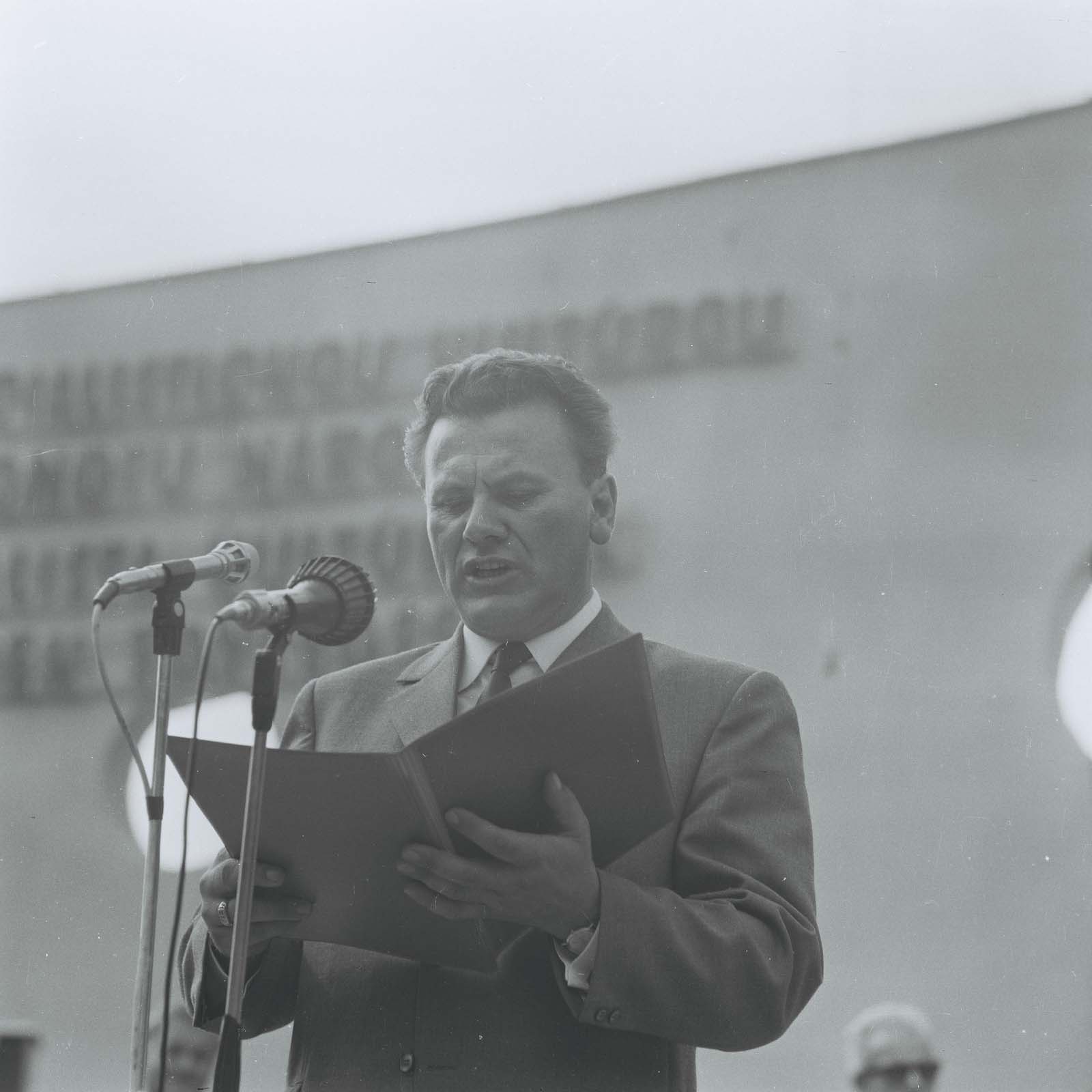 Varga Béla a Csemadok főtitkára a mikrofonnál. (XVII. Országos Dal- és Táncünnepély)